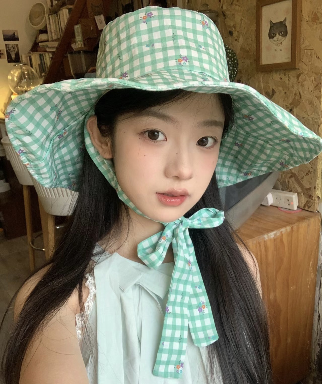 春夏ミントマンボグリーンチェック柄ストラップバケットハット旅行大きなつば日よけ帽子アウトドアサンハット