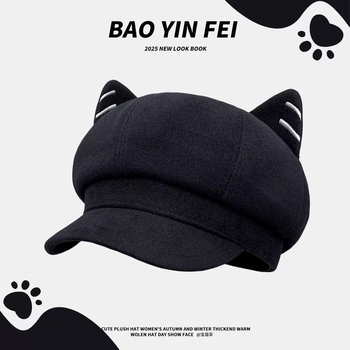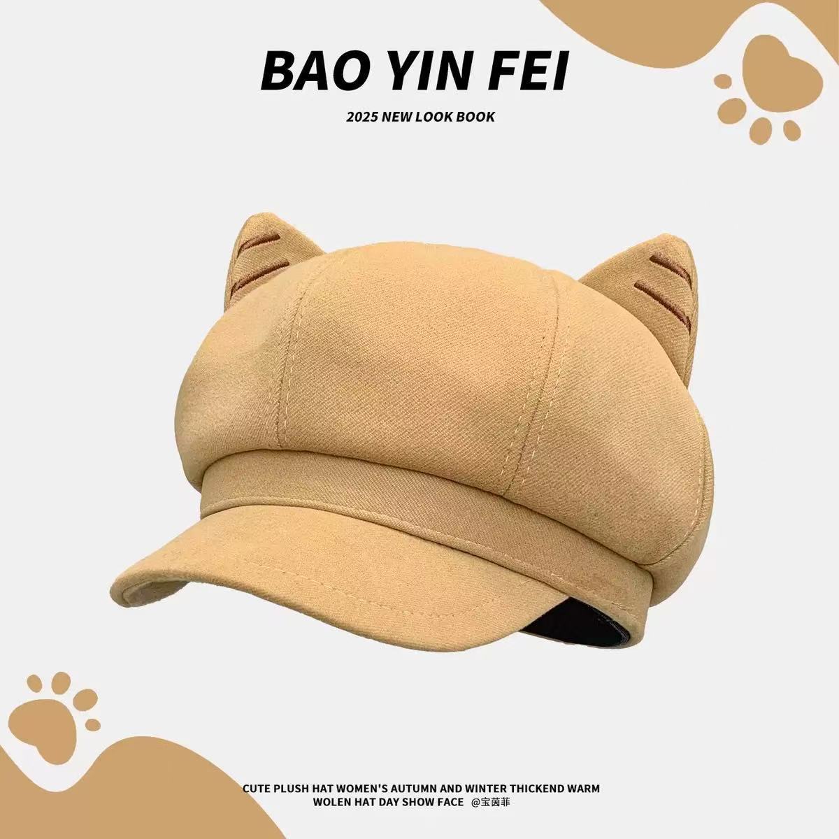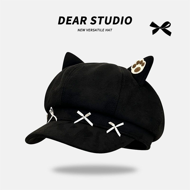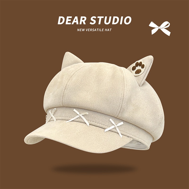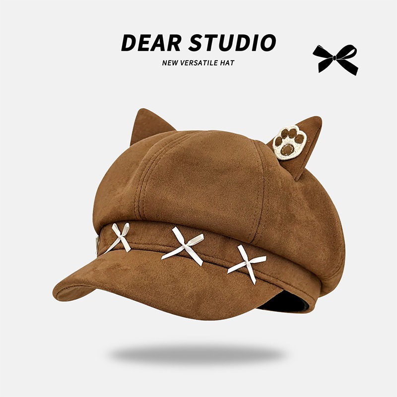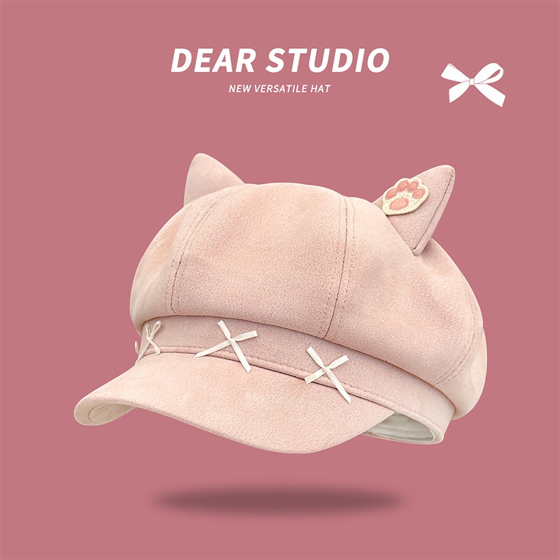 可愛い猫耳ヒョウ柄八角帽子季節暖かいスエードベレー帽キャスケット帽