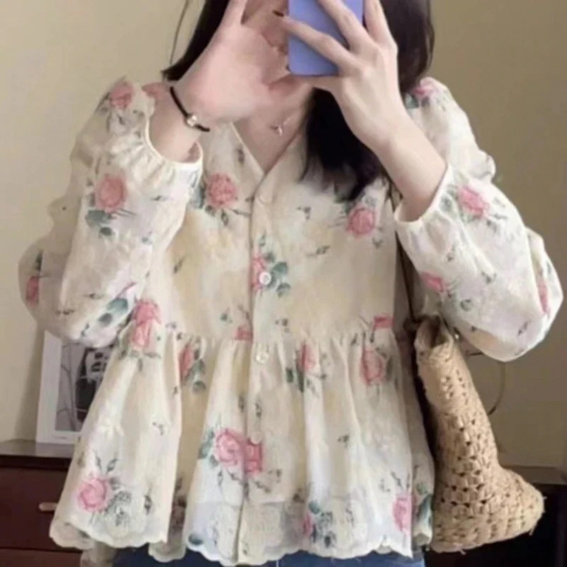 2026年春新作 小柄な方におすすめショート丈レースシャツ デザイン性のニッチなパフスリーブ花柄ブラウス・シフォンシャツ