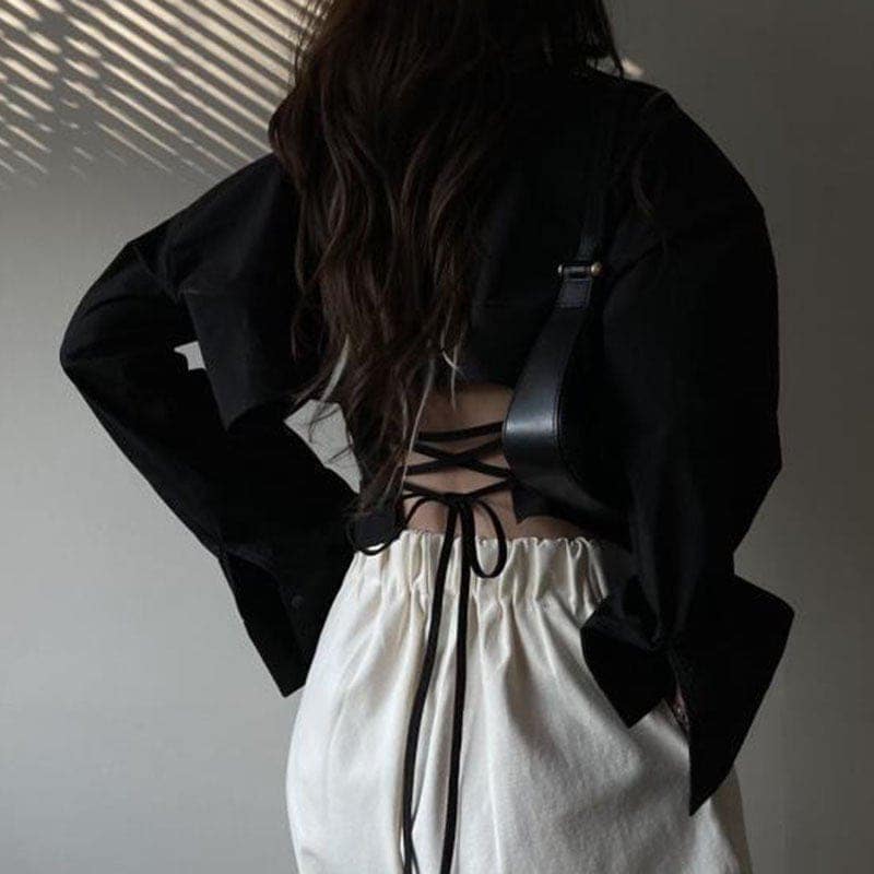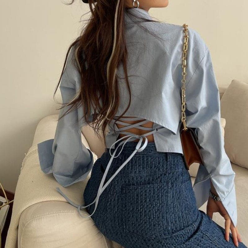 韓国小众セクシーで甘くクールな辣妹デザイン後紐 シルエットを美しく見せるスリム長袖シャツトップス・シフォンシャツ