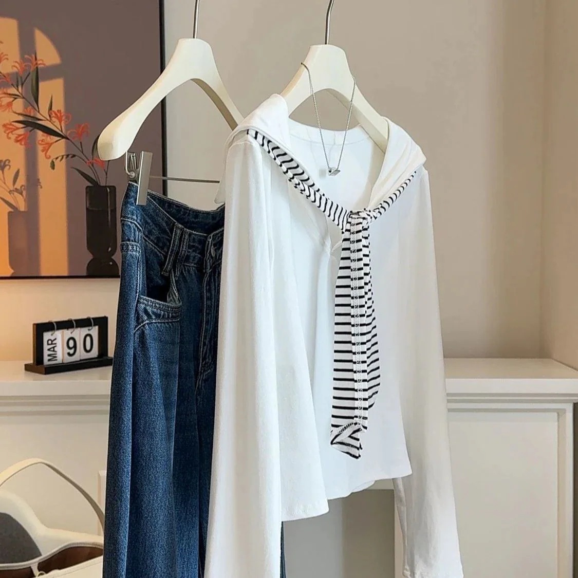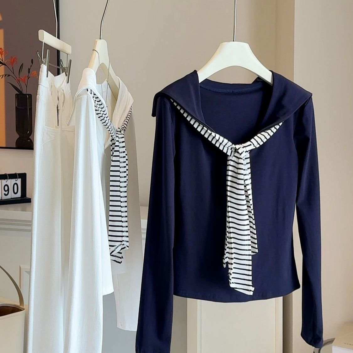 ネイビーストライプのストラップ付きフェイクツーピース長袖Tシャツ(女性用) 2026年春・秋新作 スリムシルエット 痩せて見えるトップス Tシャツ・ラウンドネックスウェット