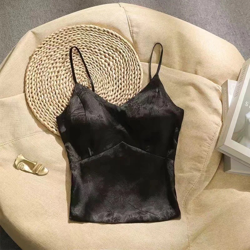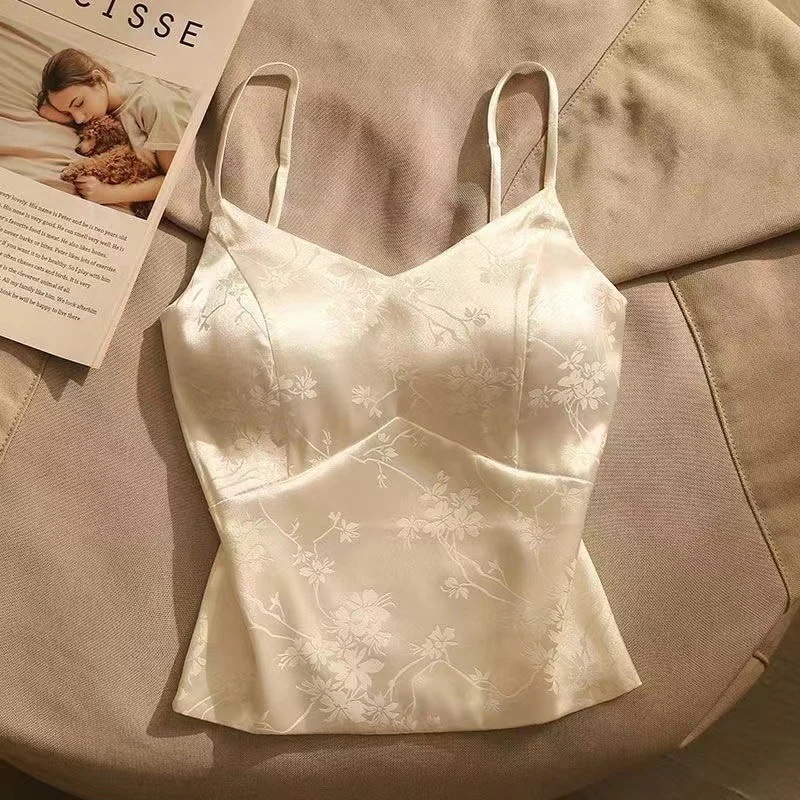 新作フレンチジャカードサテンストラップタンクトップ(女性用)パッド付き刺繍タンクトップ万能で個性的なトップス