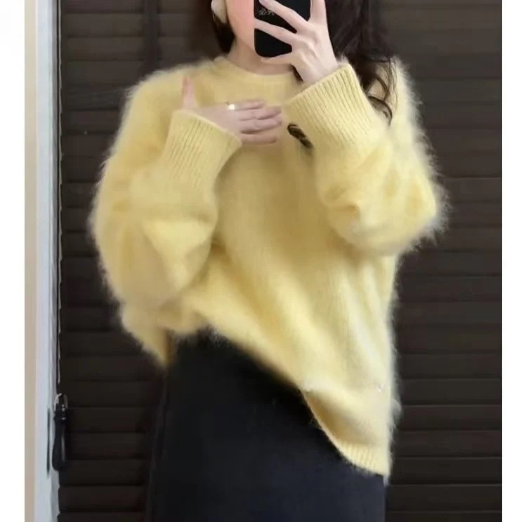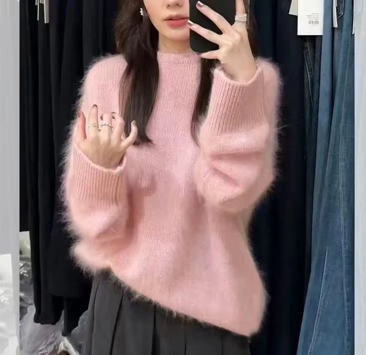 冬のコーディネート 風ゆるい雰囲気 上品な印象 プルオーバー 丸首 マーモット毛 柔らかくしたピンクの厚手セーター
