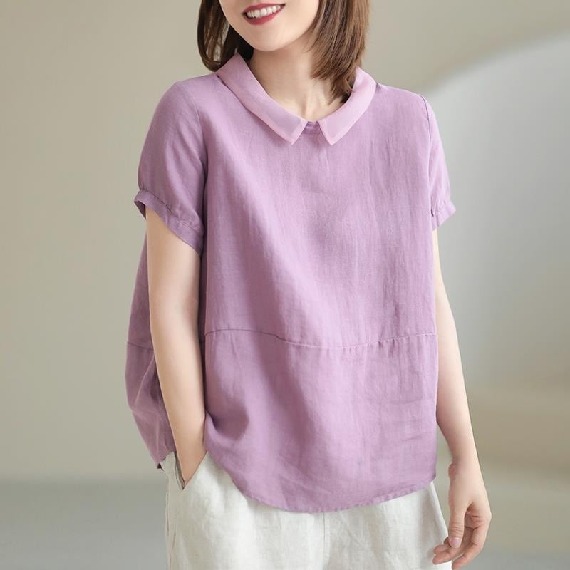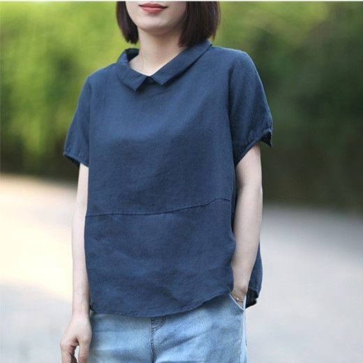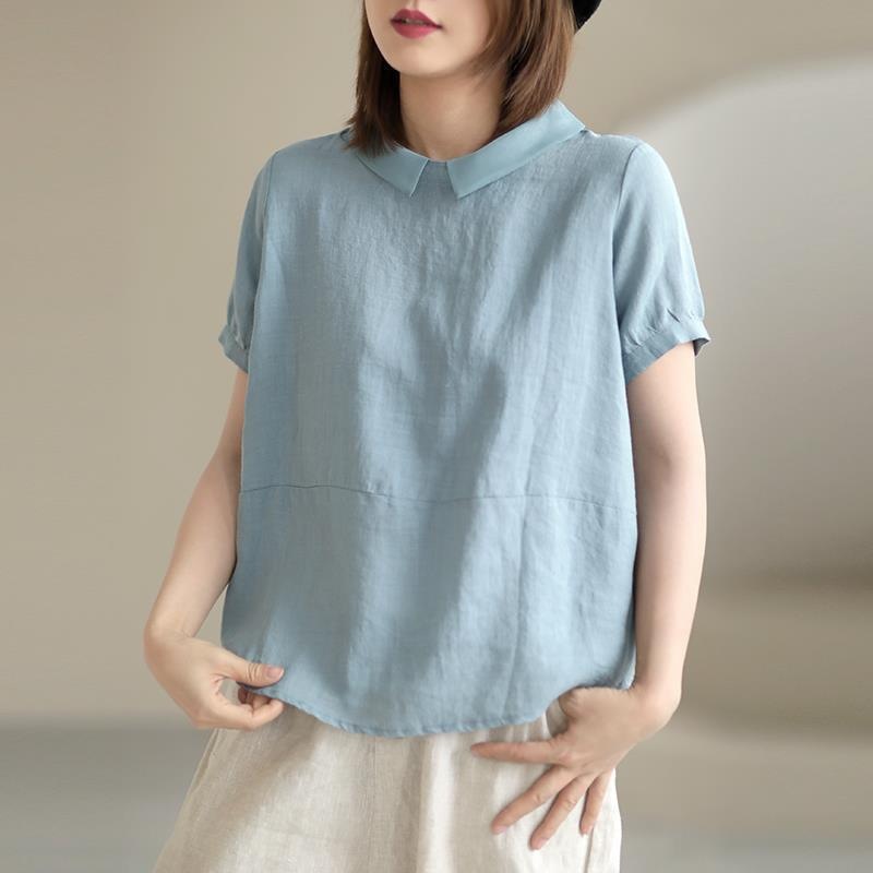 2026夏新作アートカジュアル韓国風ゆったりリラックスプラスサイズ麻混紡風半袖パッチワークカラーシャツレディース