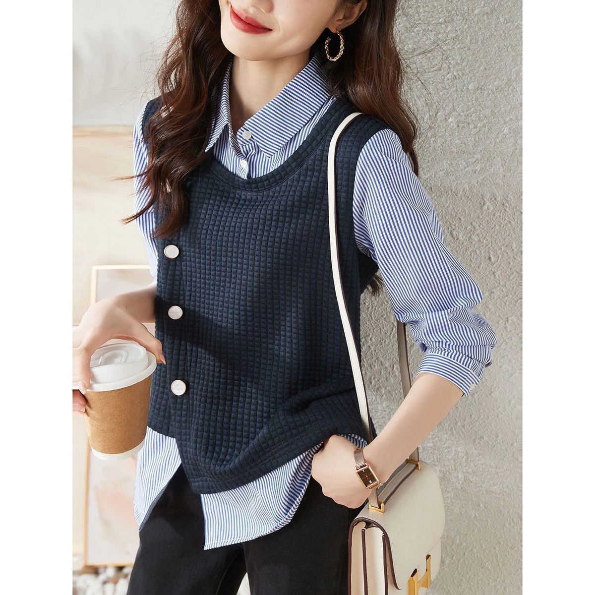 フェイクツーピースストライプシャツ2026春秋新作デザイン感アシンメトリーゆったり細身長袖シャツレディース
