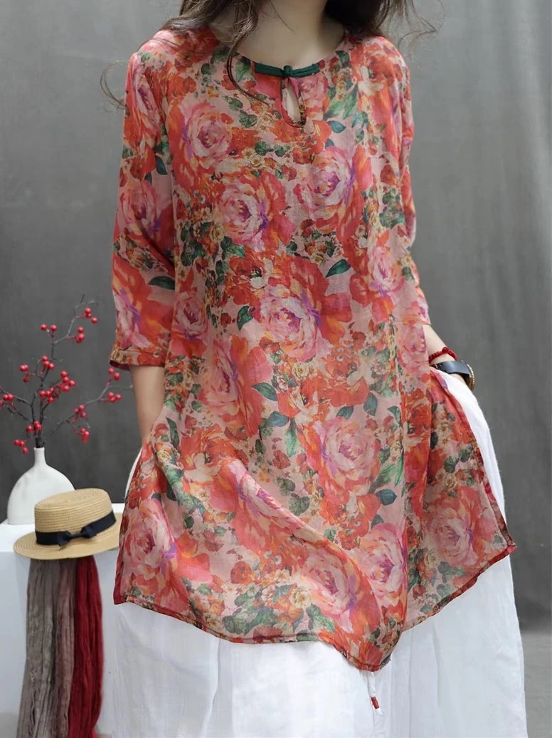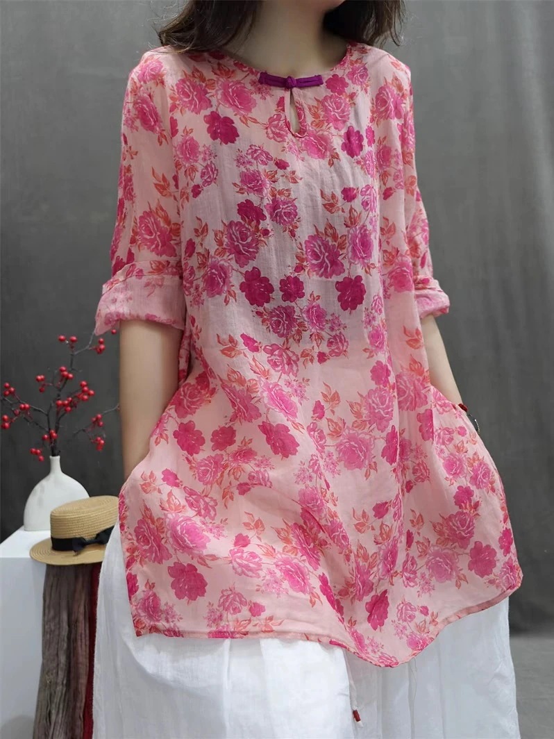 レトロでおしゃれな薄手小花柄ミディ丈シャツ 大きめサイズレディース夏用ゆったり丸首ボタン留めシャツ