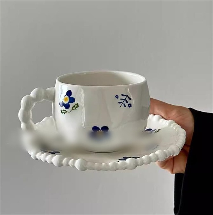 激安セール 手彫り風の凹凸模様と青い小花柄が織りなす ヴィンテージティーセット マグカップ+ソーサー2点セット