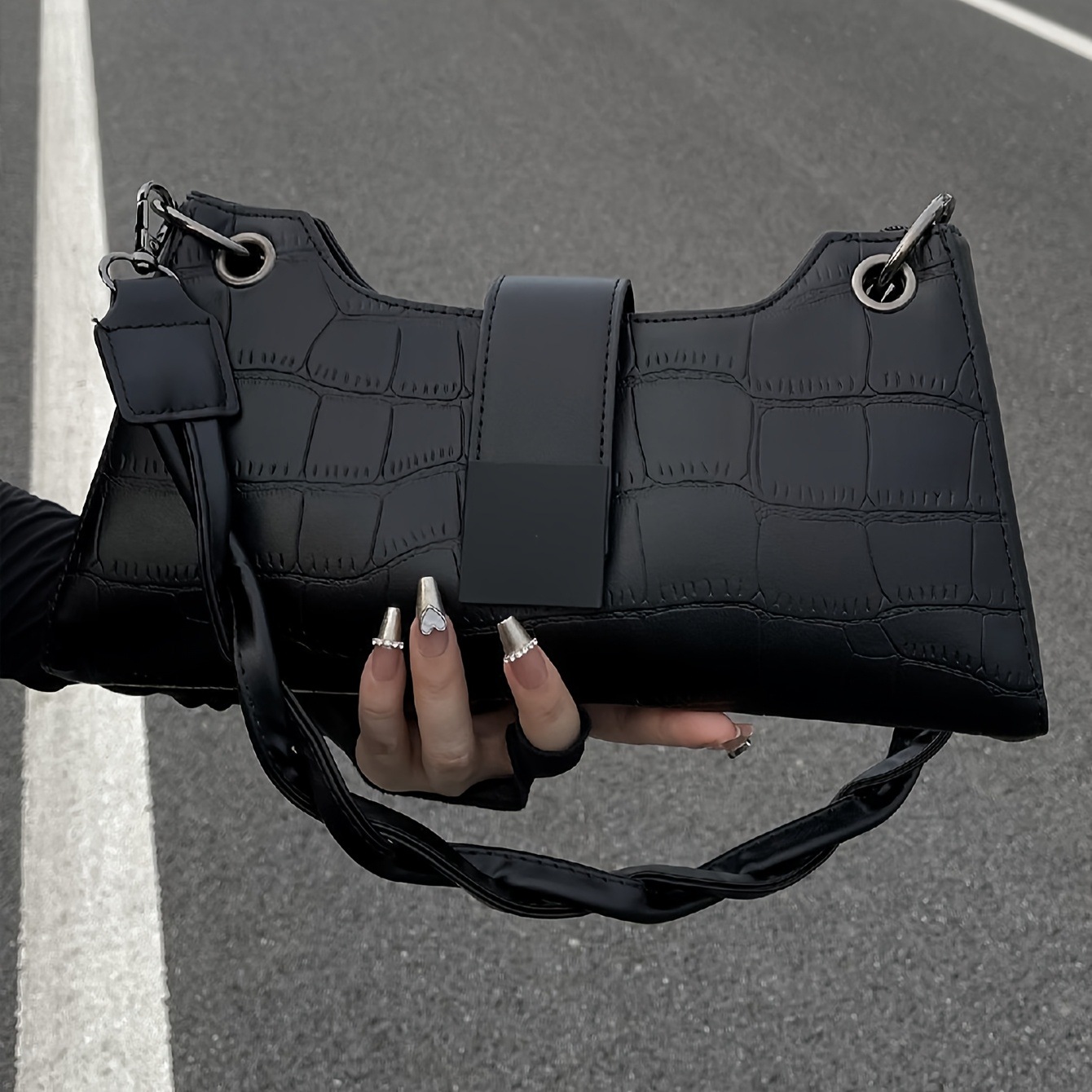レディース ブラック クロコダイル柄 ショルダーバッグ - 調節可能なショルダーストラップマグネット式開閉スタイリッシュなデザインゴールドの金具クロコダイルウォレット