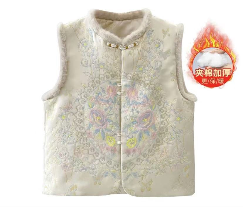 2026 冬の裏地が綿入りで厚みのあるベスト新中華風のゆったりとしたラウンドネックで女性らしい気品のある刺繍と暖かいファーカラーが特徴のトップス