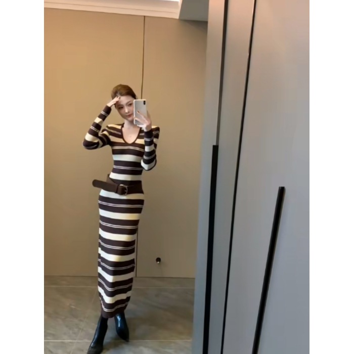 2026 秋冬の大人女性向けハイセンスなウエストシェイプ効果のあるストライプ柄長袖