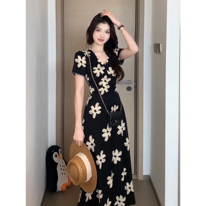 2026 レトロなレース襟の花柄半袖女性用夏のウエストを引き締めてスリムに見せるロングスカート
