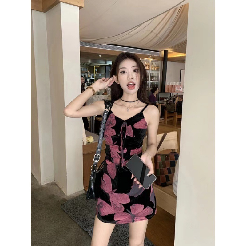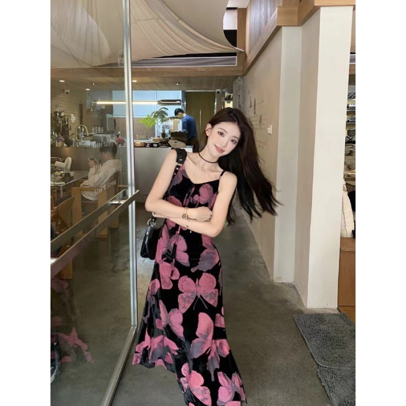 2026 蝶柄プリントのキャミソールロングレディース夏物スリムフィットウエストシェイプエレガント