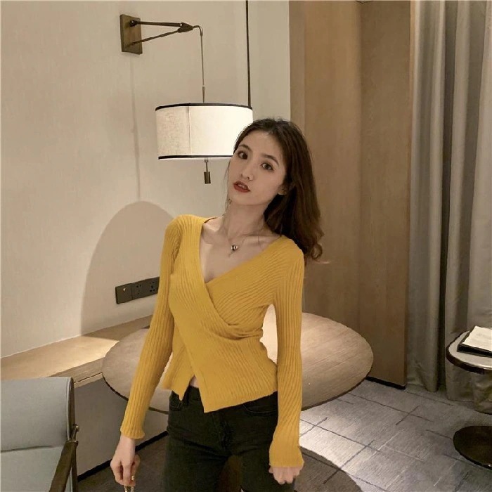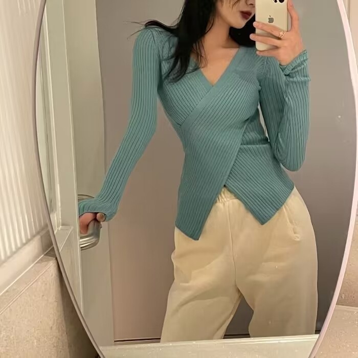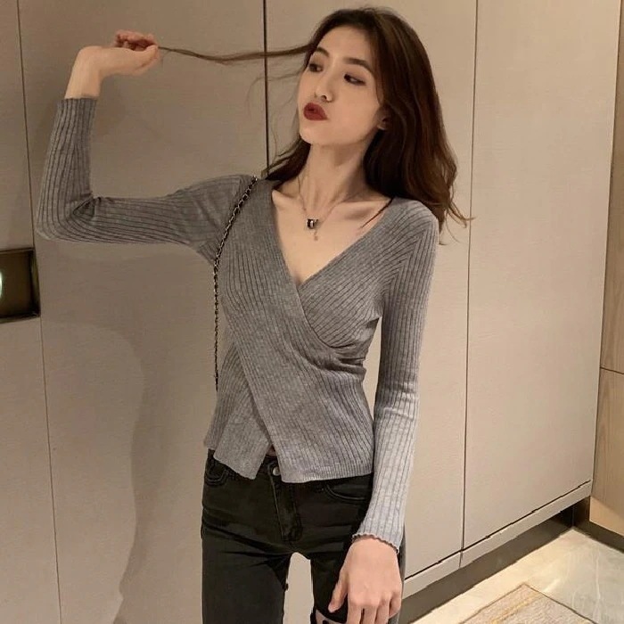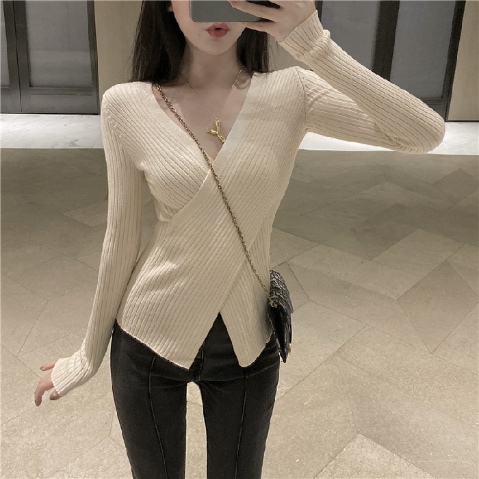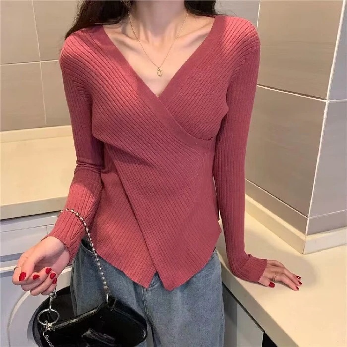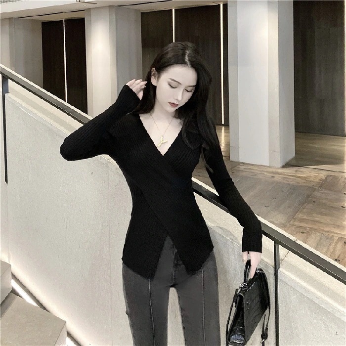 2026 個性的なデザインのクロスデザイン黒長袖ニットトップス女性用初秋向けおしゃれで万能着痩せ効果のあるトップス