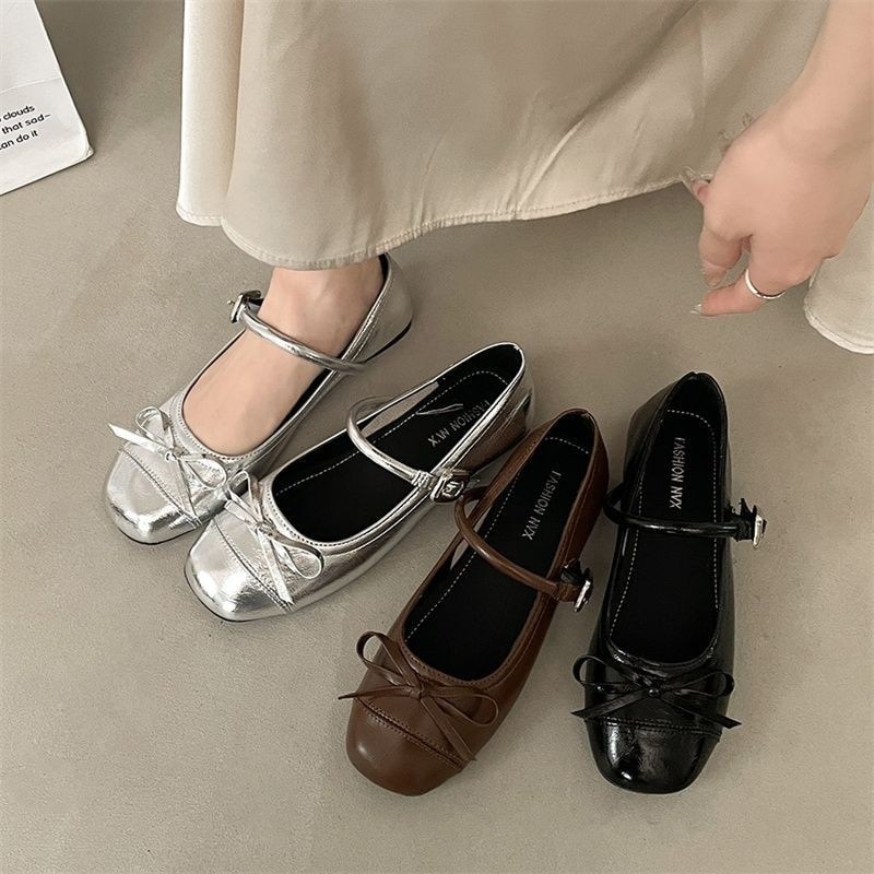 シルバー浅いバレエスタイルフラットシングルシューズ女性 2025新春スカート付きフレンチラウンドトゥメリージェーンシューズフラットシューズ