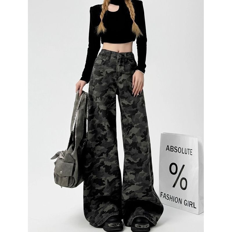2026春新作!デニムパンツレディース 迷彩柄 ロング丈ボトムスハイウエストジーンズ K-POPストリートファッション練習ジーンズ ゆったりレッグレディースカジュアル ワイドパンツ