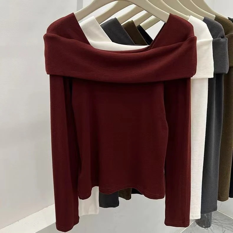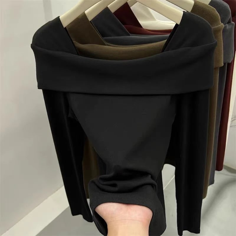 プラスサイズ ベルベットアンカラレッド長袖Tシャツ女性用 冬新作 ぽっちゃり体型向けインナー ベースレイヤー 純粋な色気オフショルダートップスTシャツ・ラウンドネックスウェット