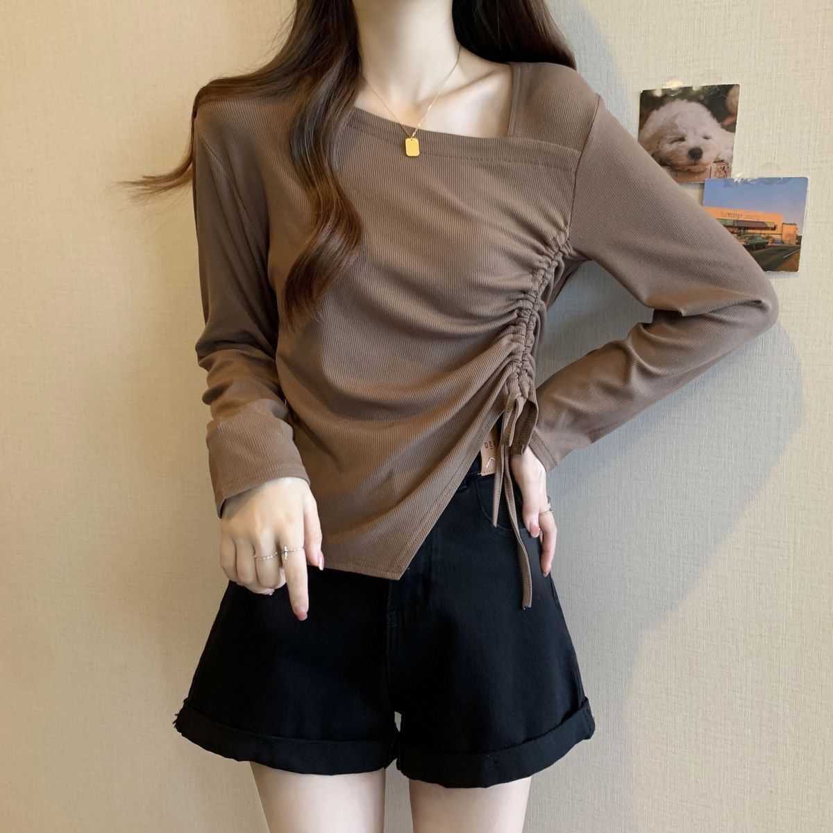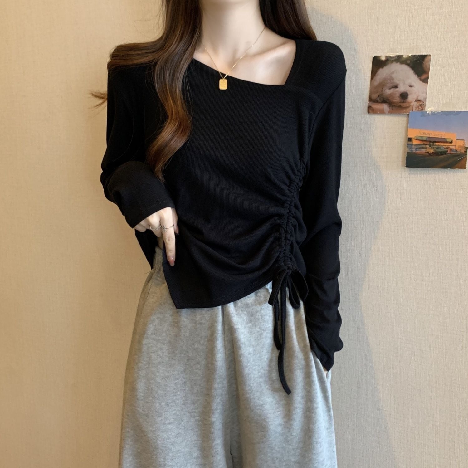 大サイズレディース韓国風おしゃれスクエアネックプリーツトップス 秋新作ぽっちゃり体型用お腹隠しスリム長袖Tシャツ・丸首スウェット