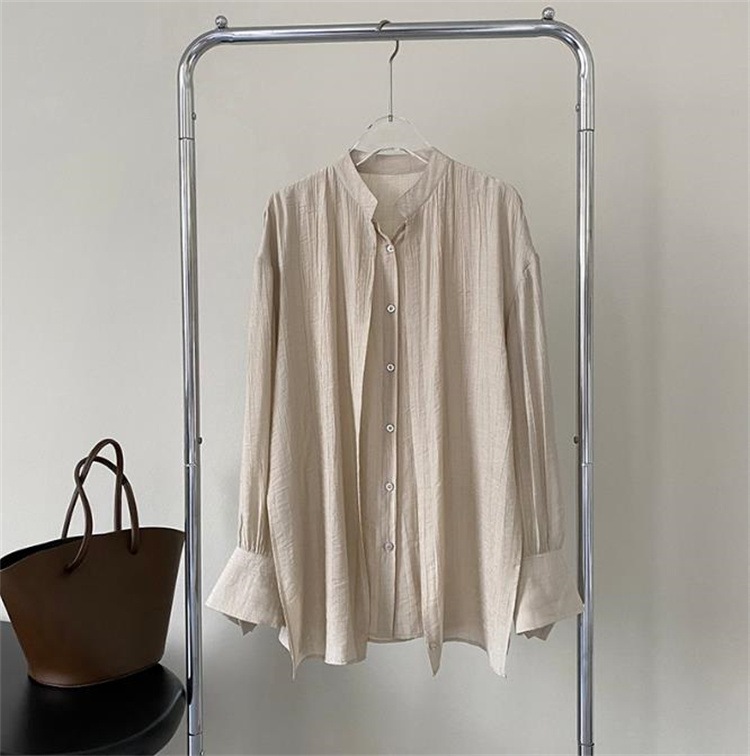 激安セール クロスベルトウエストマークスタンドカラー長袖シャツ 2026年春新作 無地でゆったりしたレディーストップス すっきりしたスタンドカラーにウエストベルトをプラス 2色選択可能なアイテム