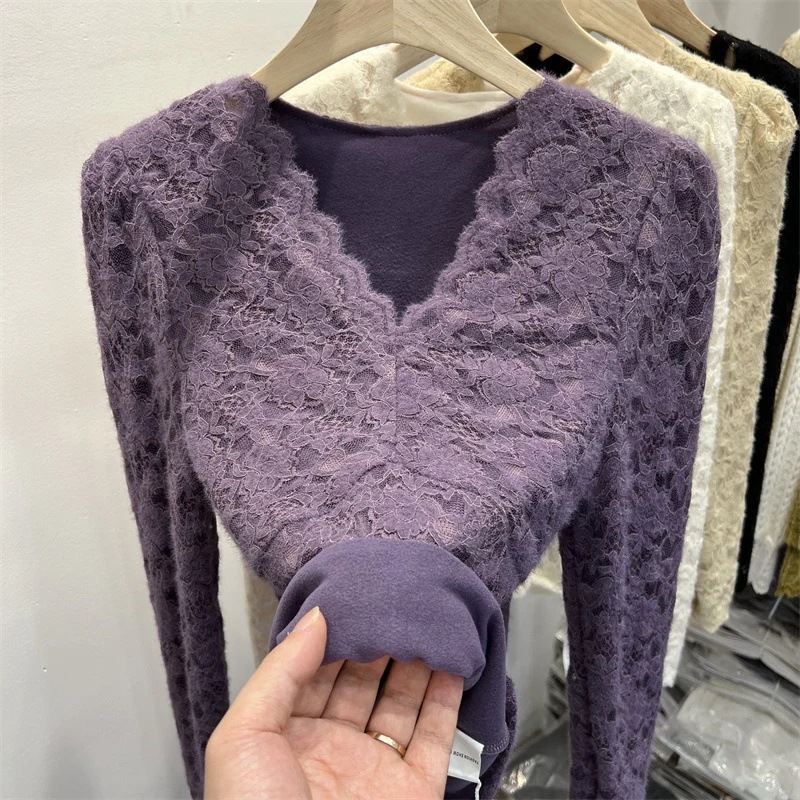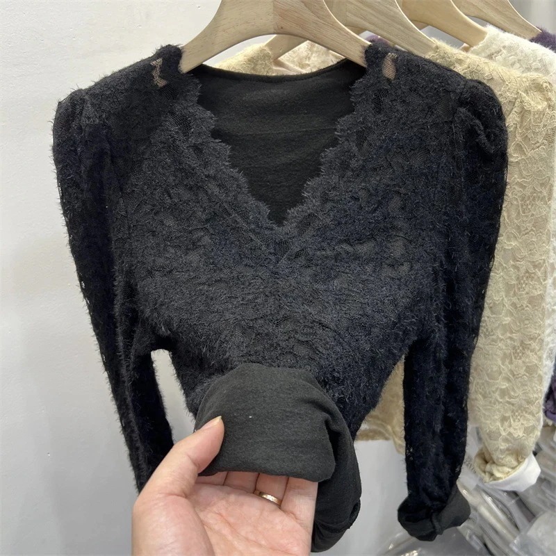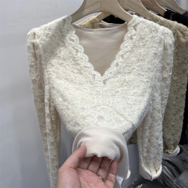 ウエスト絞りメッシュトップスファー付き秋冬用裏地付き女性用インナー厚手パフスリーブローネックVネックレース