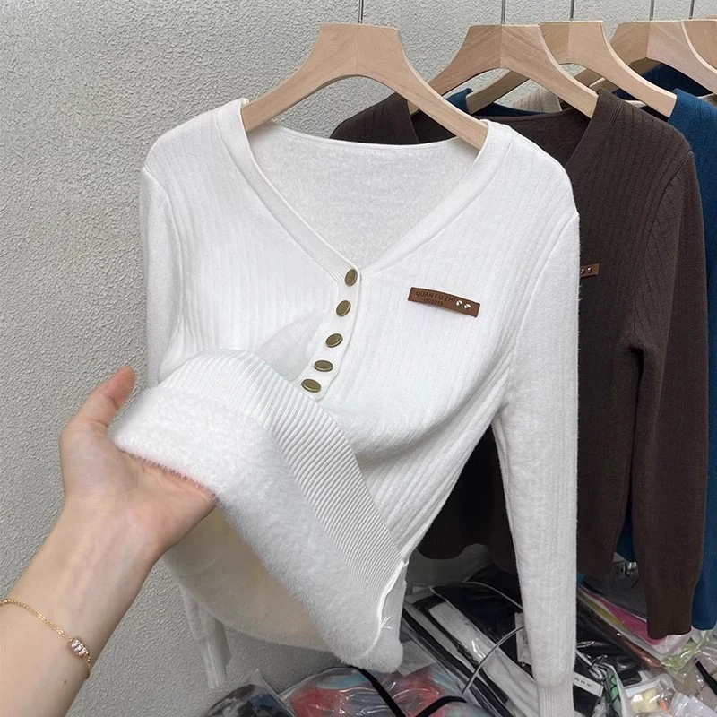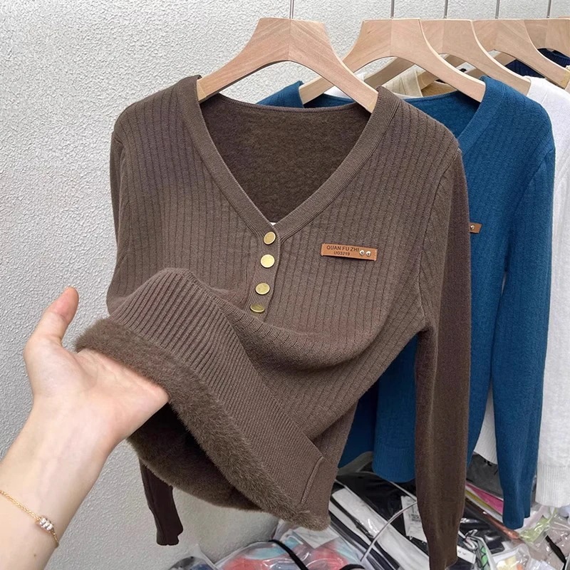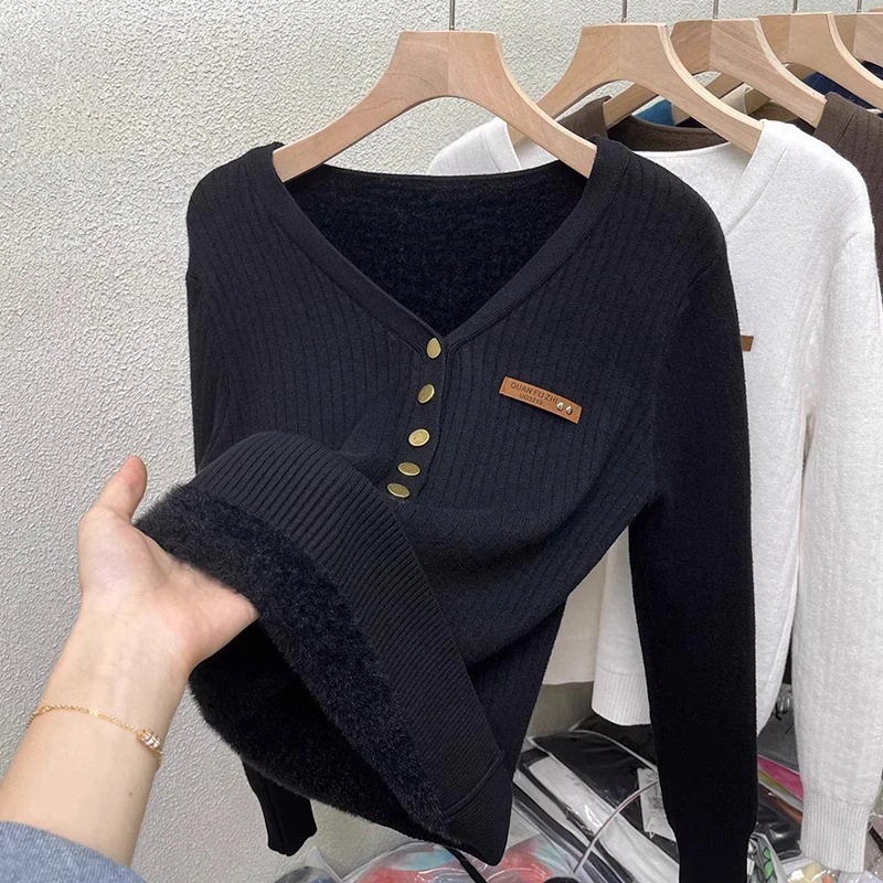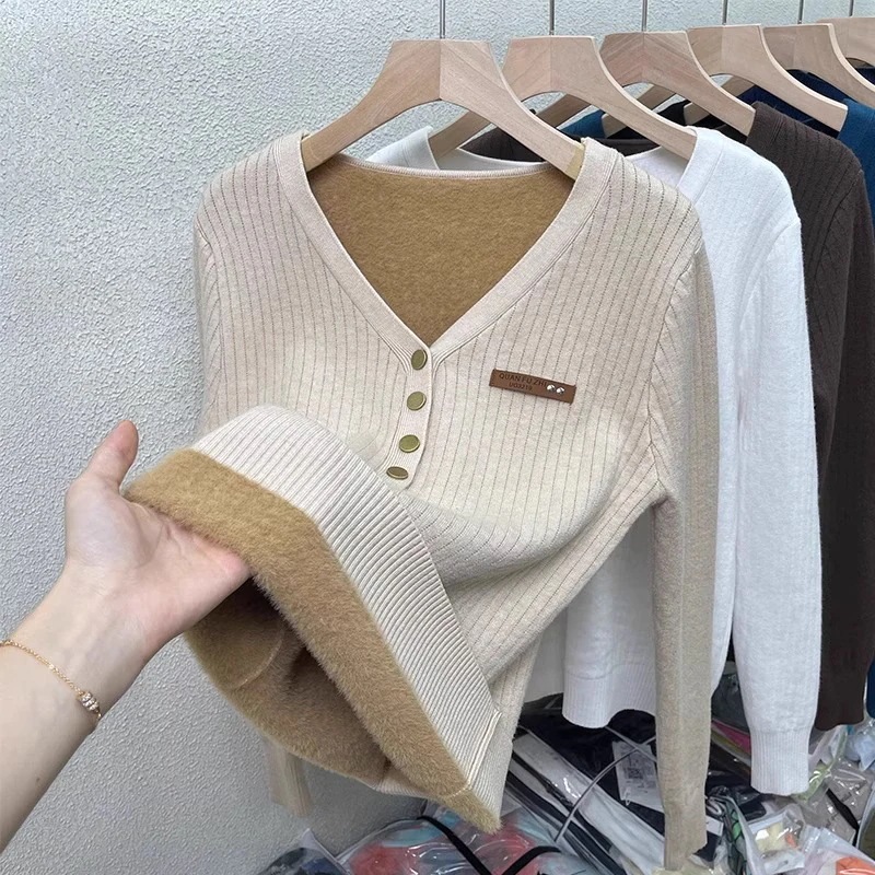 一体型起毛Vネック セーター 2025年秋冬新作裏起毛・厚手 フィット感 ニットベースレイヤー