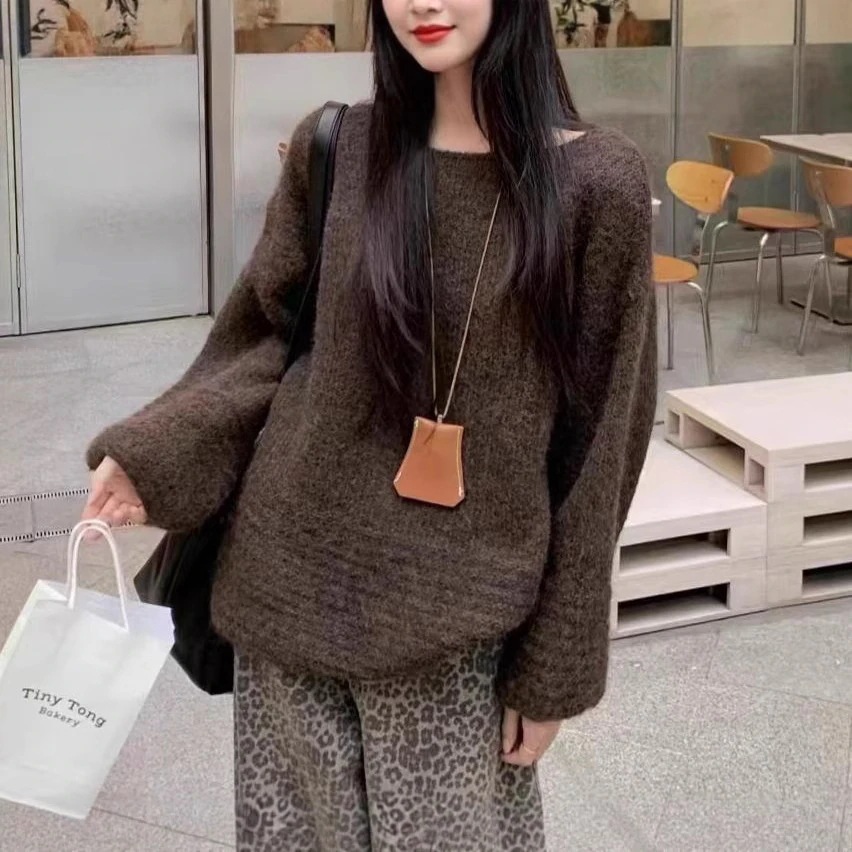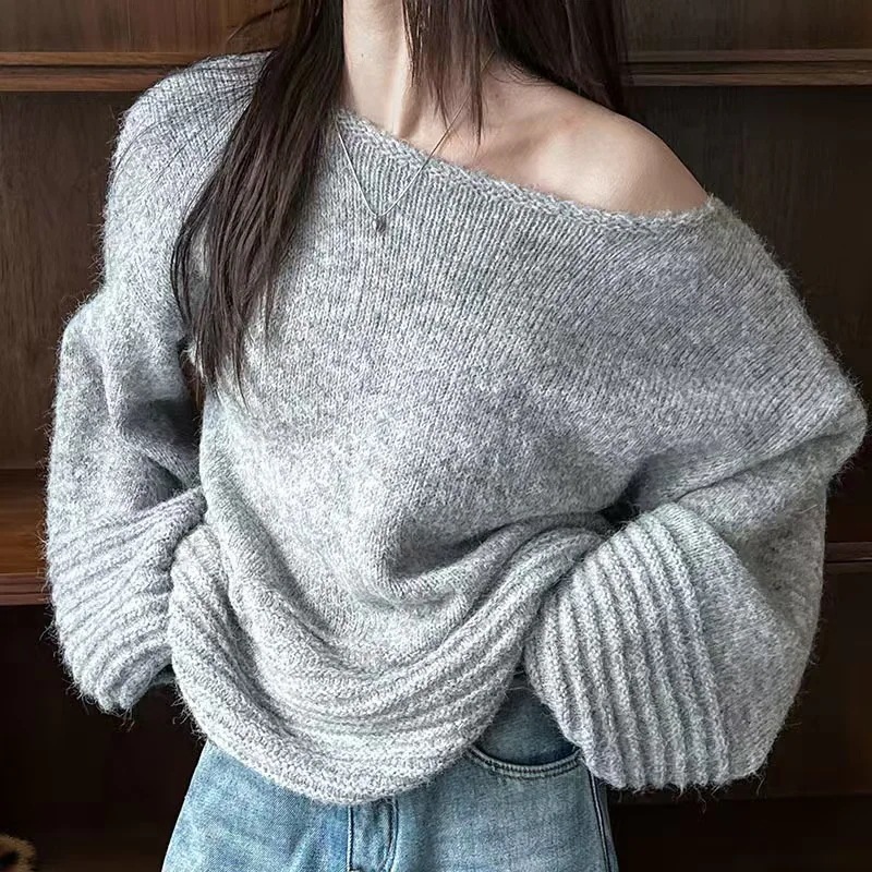オフショルダーセーター 女性 秋冬 斜めネック 肩出し 長袖 ゆったり柔らかなニットトップス