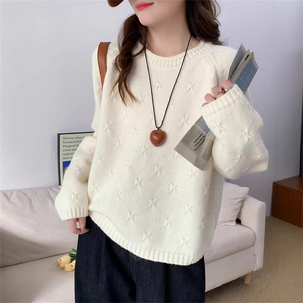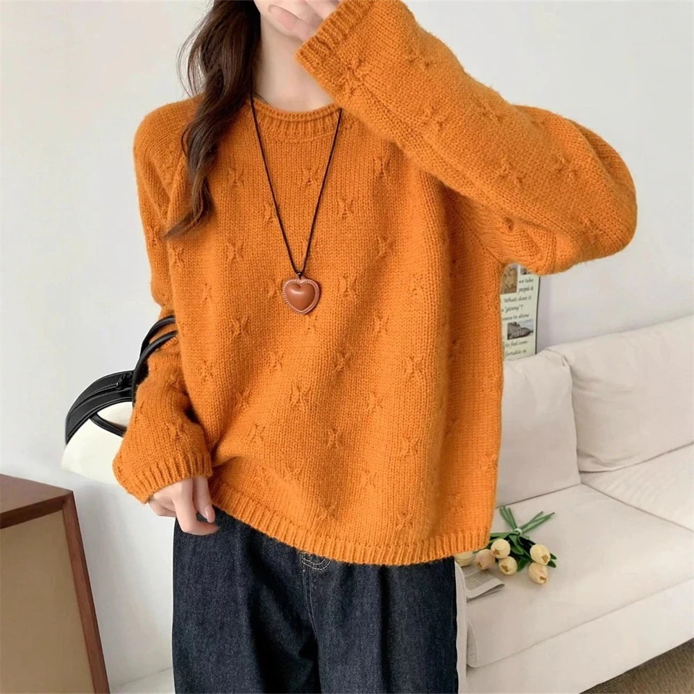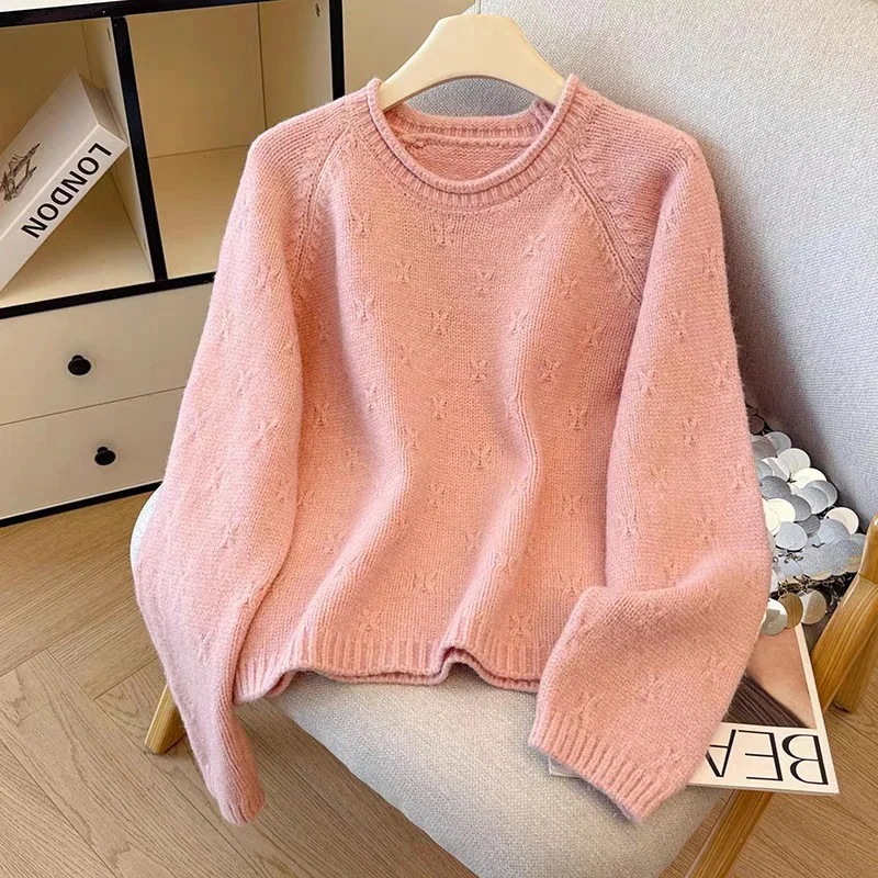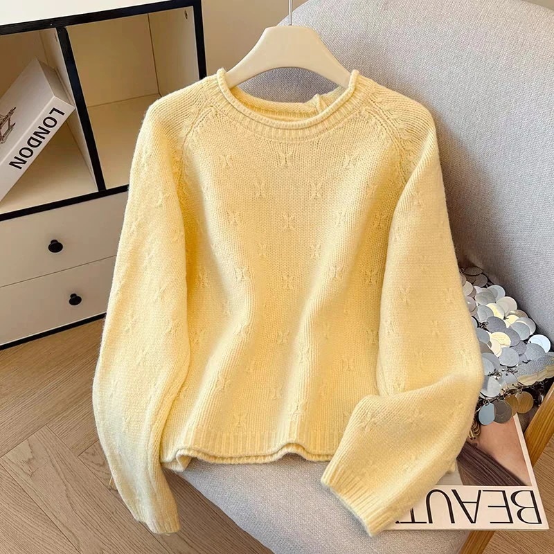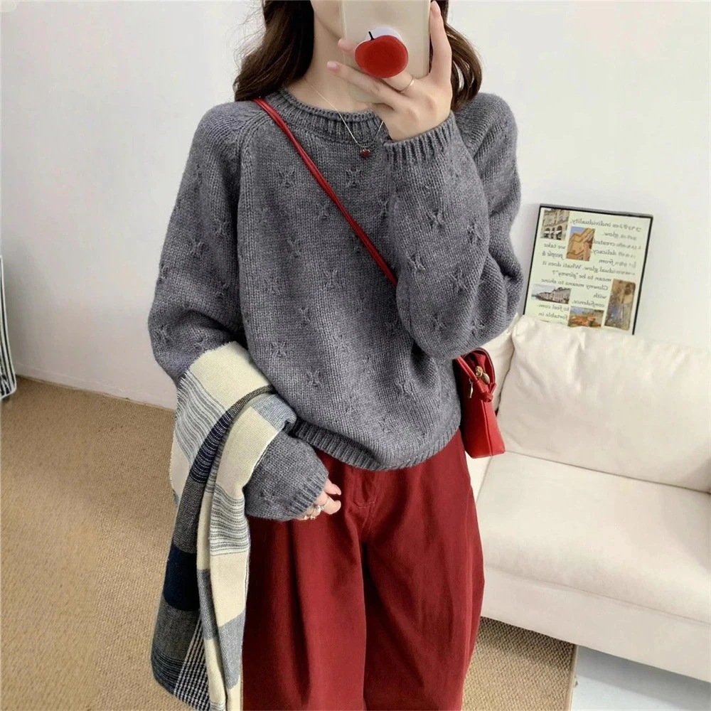 風 ロールアップ 立体編み 刺繍 丸首 プルオーバー セーター女性用 ドロップショルダー ベースレイヤー ニットトップス アウター