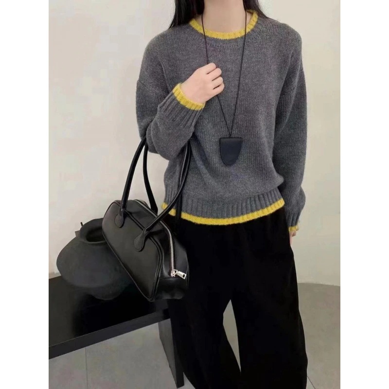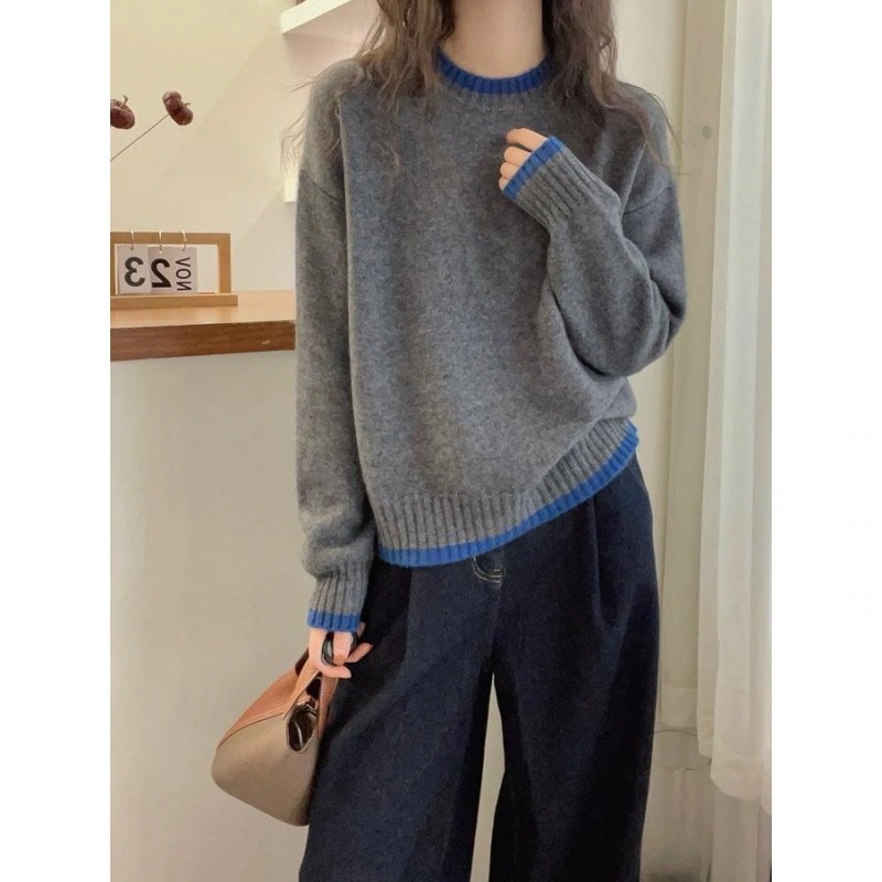 2025年秋冬 風 グレー ツートンカラー 丸首 プルオーバーセーター 女性用 レトロ風 柔らかなニットトップス 細身に見えるトップス