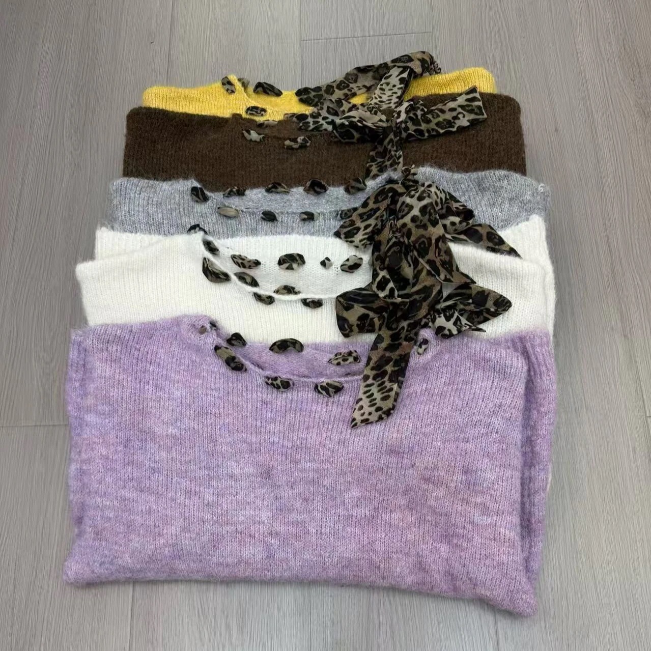 ルーズな豹柄 蝶結び 紐付き 丸首プルオーバー セーター2025年秋冬 柔らかくしたニット ゆったりトップス