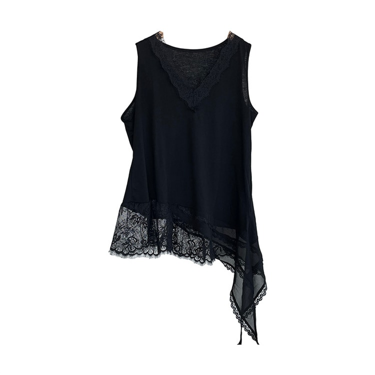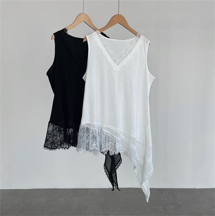 早い者勝ち 2026年新作 丸首ノースリーブレース切り替えキャミ ゆったりドロップショルダー アンバランス裾で体型カバー 無地シンプルデザイン 2 色から選べるトップス