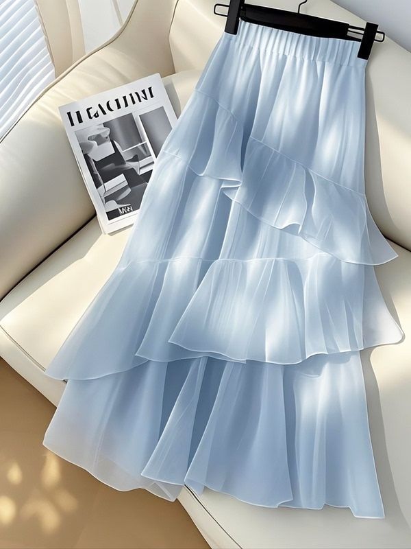 春夏 レディース 新作 上品 おしゃれ ユニーク ブルー シフォン ティアードスカート ハイウエスト Aライン フレアスカート