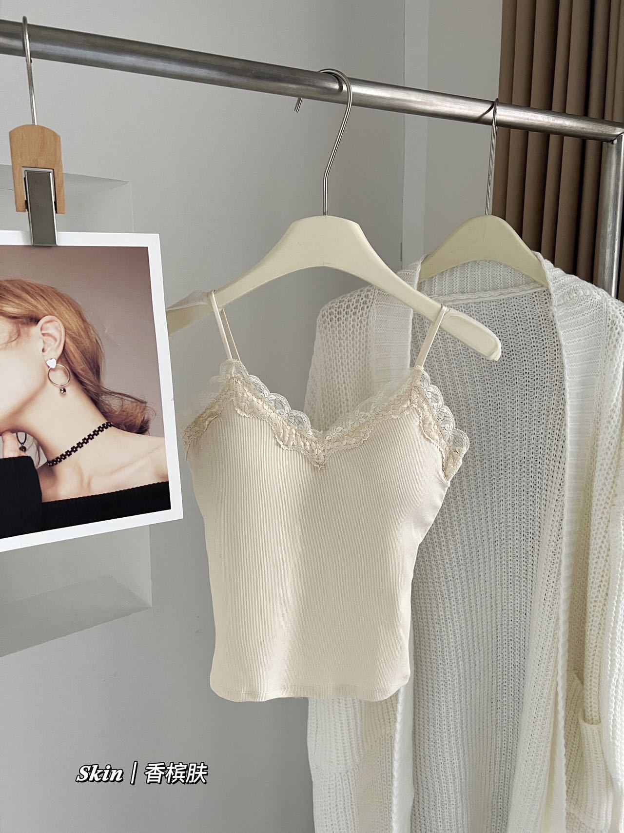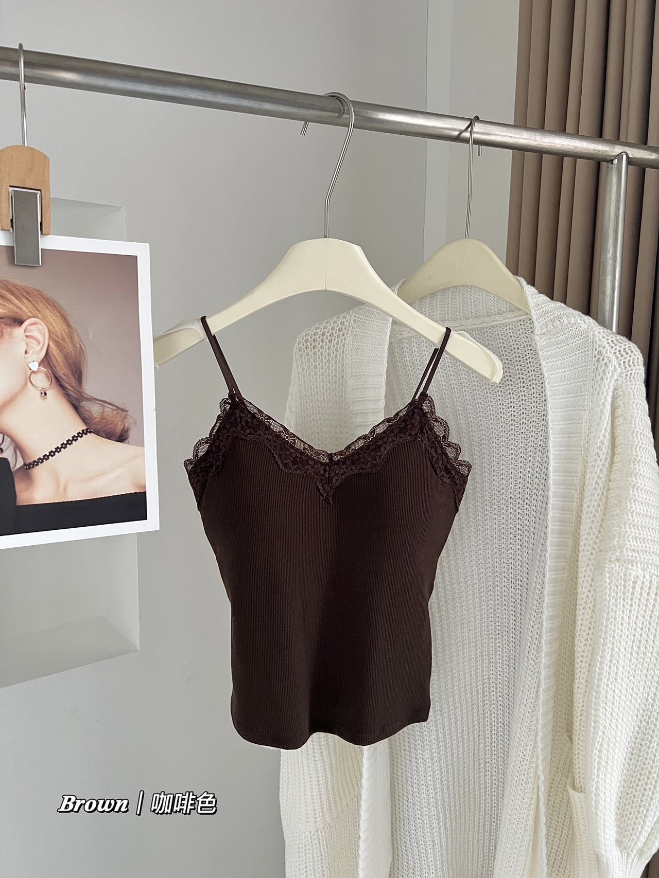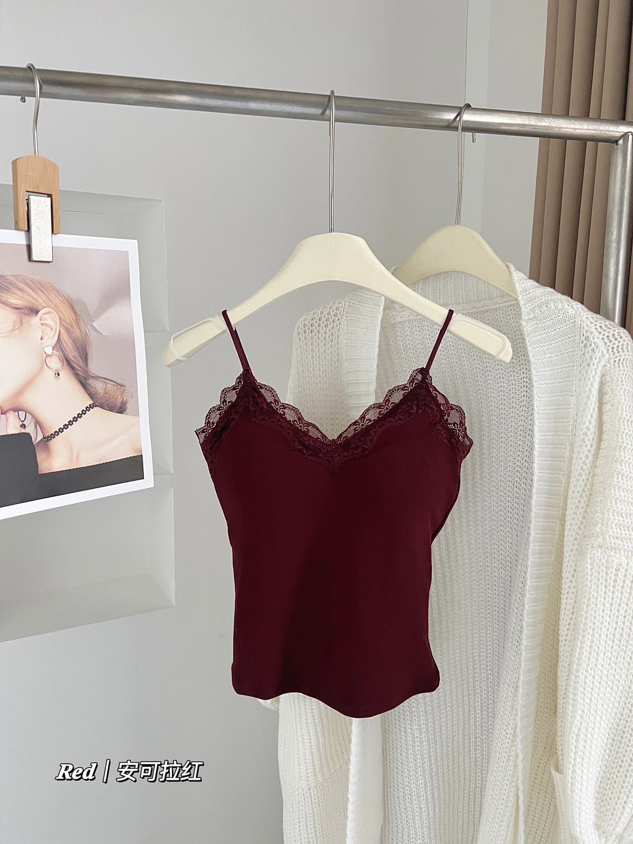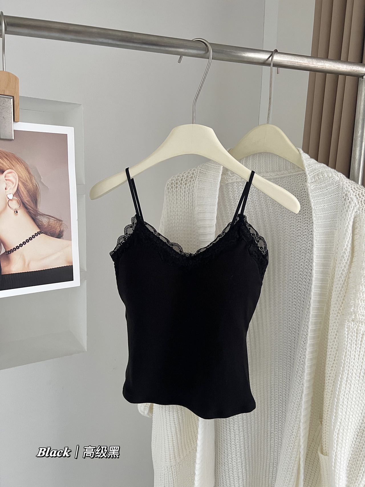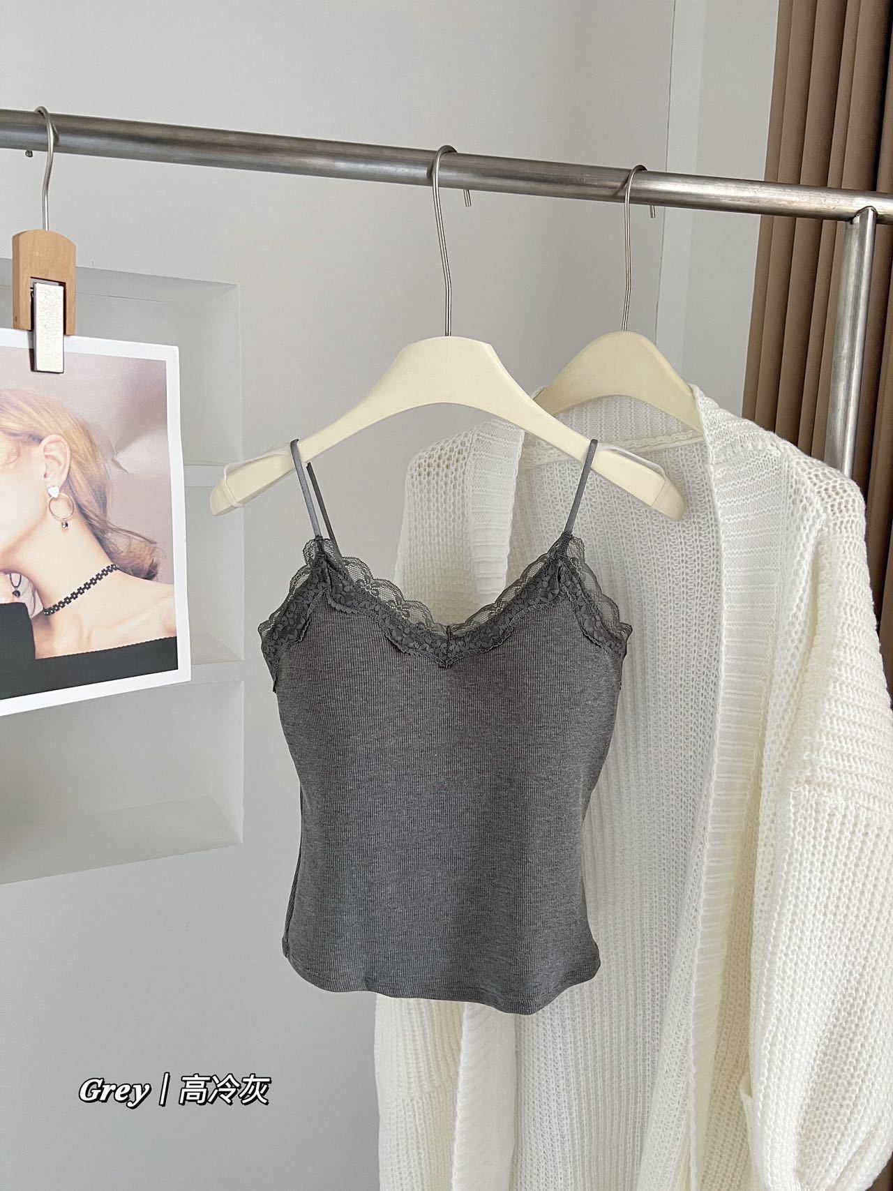 秋冬新作フレンチスタイル起毛一体型レースリブタンクトップ インナーとしてもトップスとしても使える美背ストラップタンクトップ