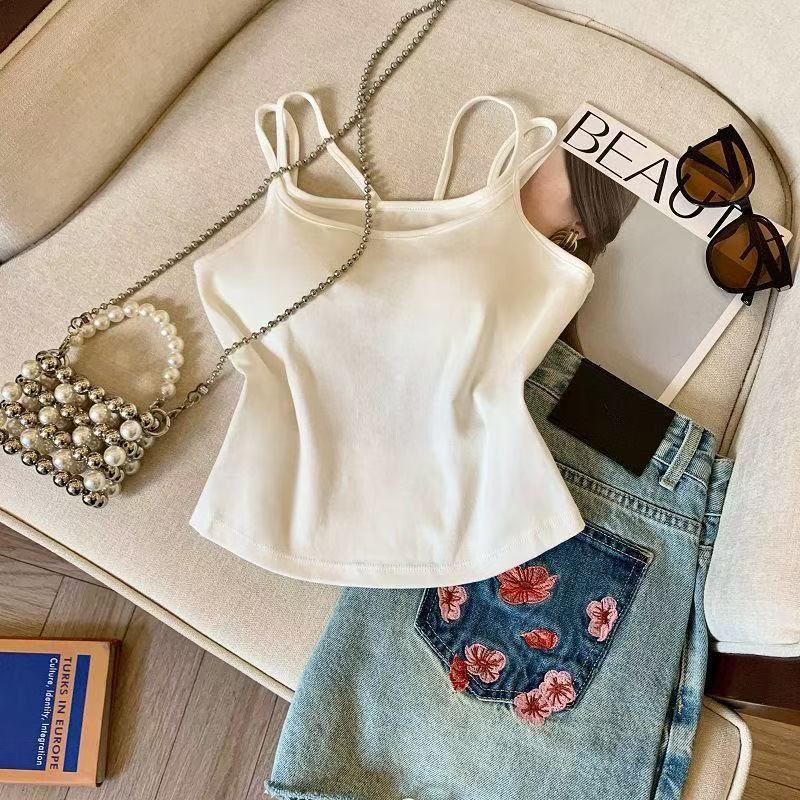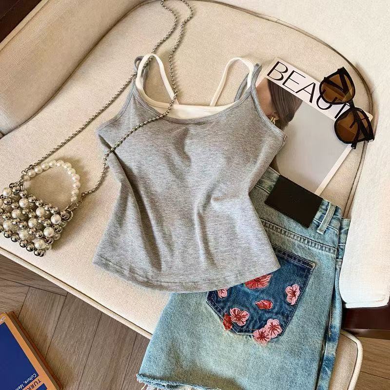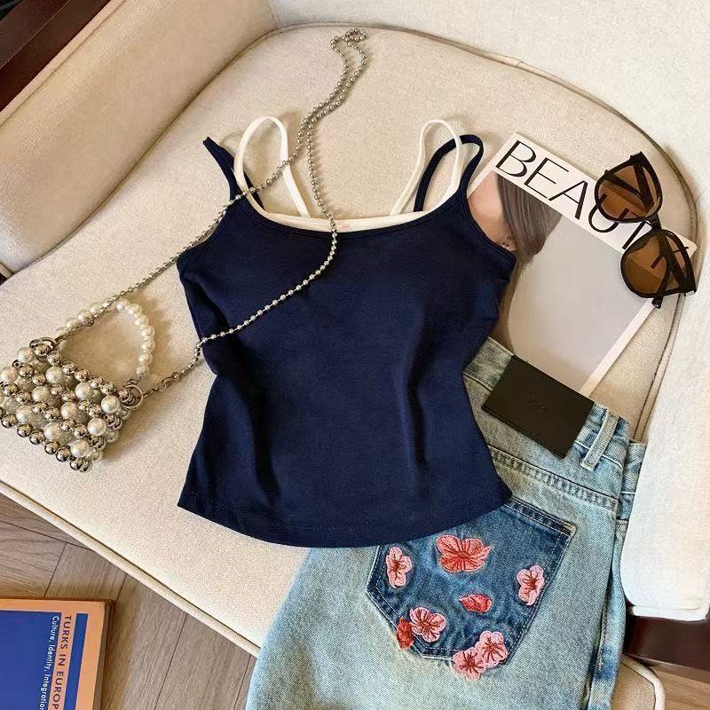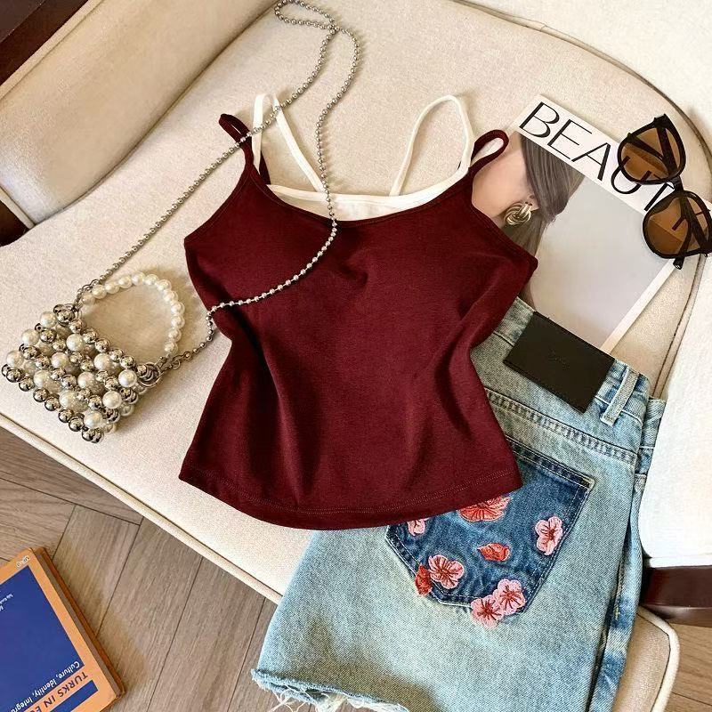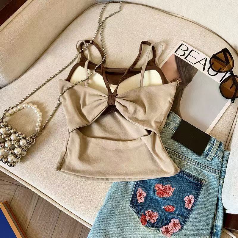 ホットなタンクトップ風2枚重ね風リボンデザイン透かしバックストラップ 固定カップ切り替えカラーブロックタンクトップ女性用ストラップタンクトップ