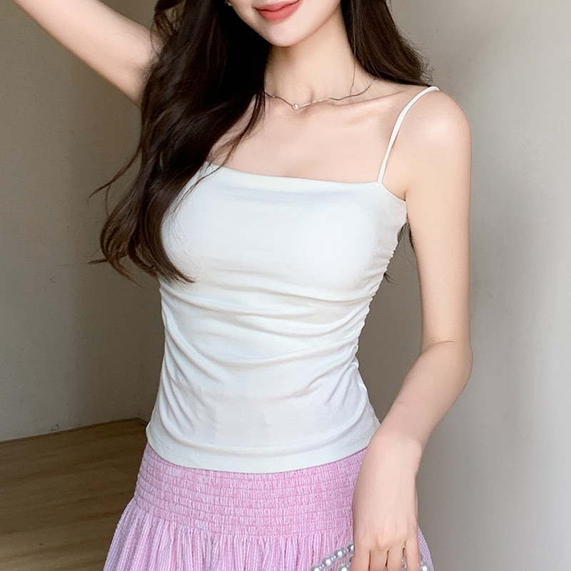 新作フリルタンクトップ インナーとしてまたトップスとして着用可能パッド付きで体型を美しく見せる万能なショート丈トップスストラップタンクトップ
