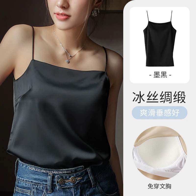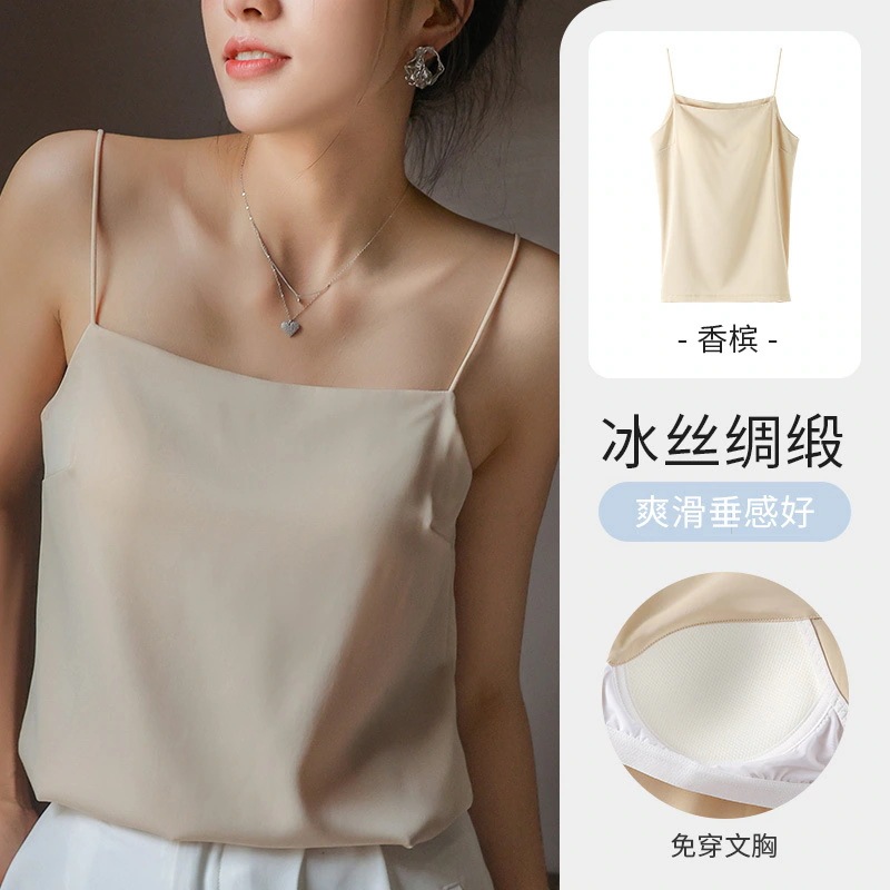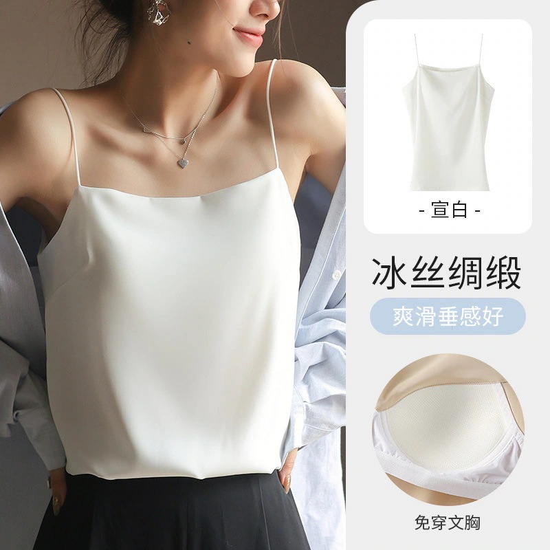 夏の新作ストラップタンクトップ女性用インナーパッド付き オフショルダーアウター用アイスシルクストラップタンクトップ美背ベースレイヤー