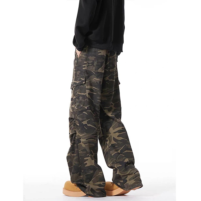 アメリカンレトロ迷彩デニムパンツ 春のハイストリートワイドワークパンツ オーバーサイズゆったりパラシュートパンツ 男性用