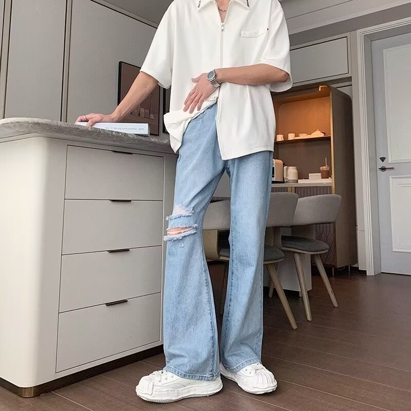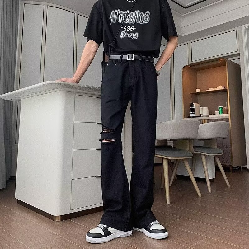 アメリカンスタイルの雰囲気パンツハイストリートファッションブランドのブラックダメージジーンズ男性用デザイン性のあるニッチなスリムストレートジーンズ