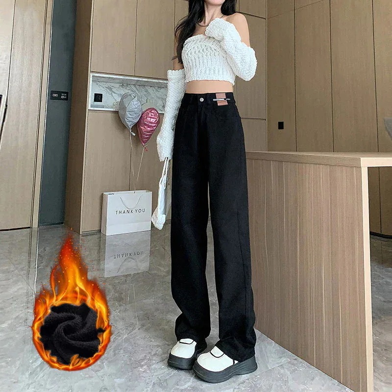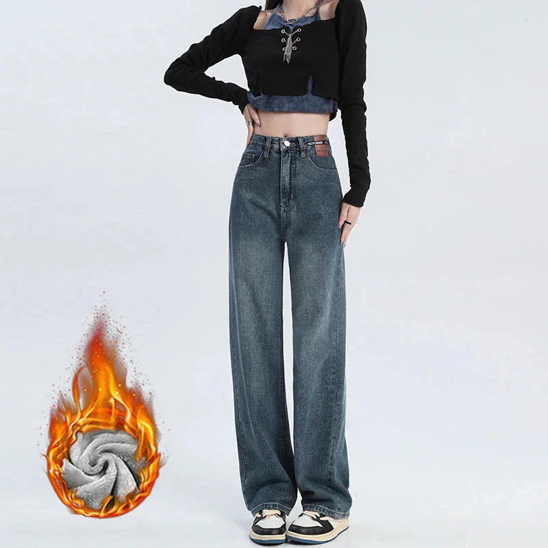 激壳れストレートレトロヴィンテージ裹起毛保温ワイドレッグ厚手ハイウエストデニムパンツ