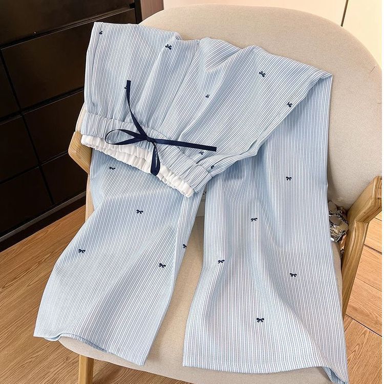 【2枚で2OO円OFF】冷感ワイドパンツ ストライプ ボウタイプリント レイヤード風デザイン 可愛い コーデしやすい レディース 春夏用