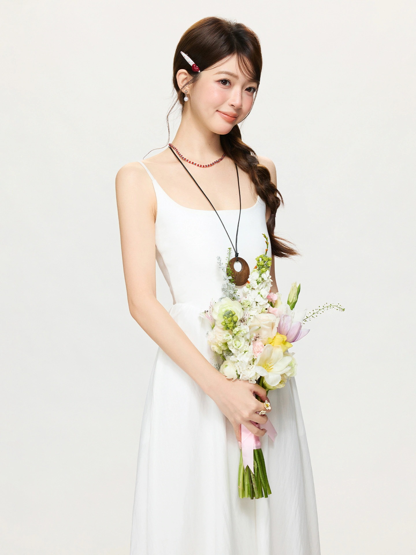 フランス風優雅なホワイトベルト付きバックレスブラトップドレス 女性春夏新作 ビーチリゾートサンドロングドレス