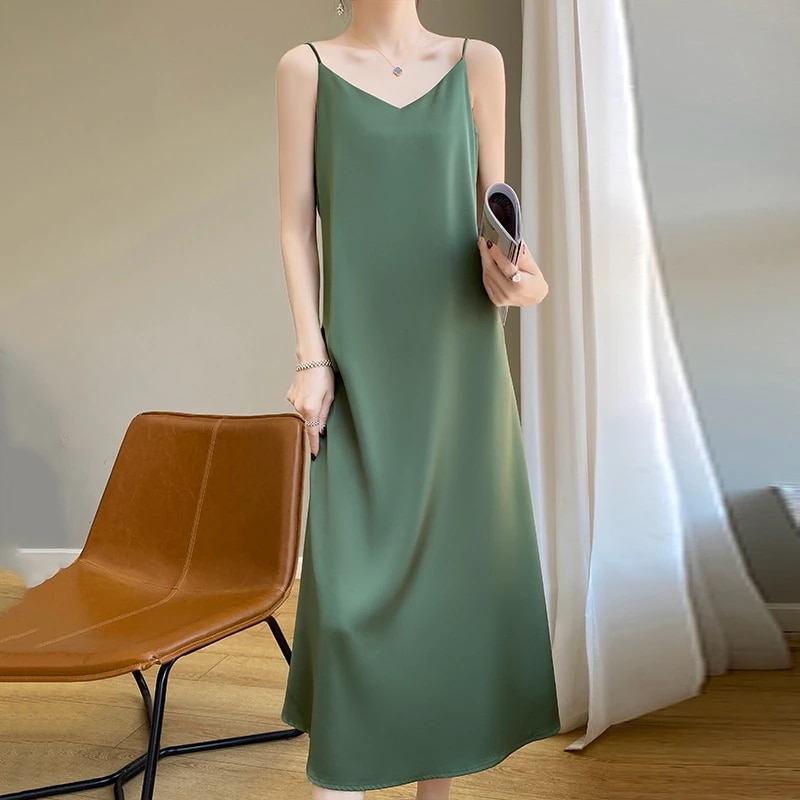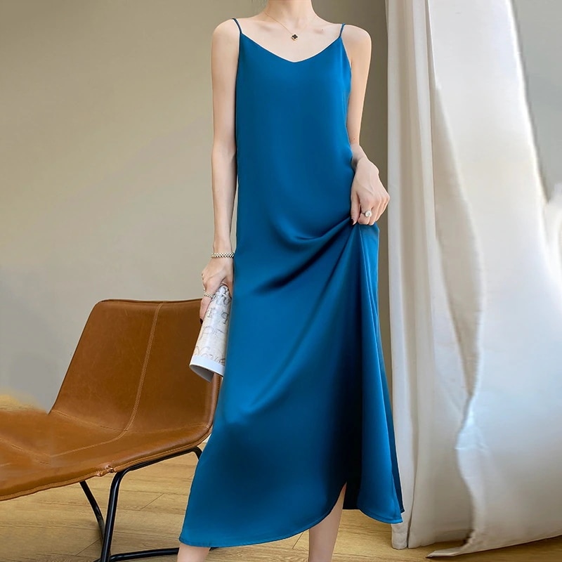 シルクサテン ワイヤードドレス 女性 フランス風 春秋 中丈 Aライン リブドレス 薄手 綿質 シルク Vネック 夏