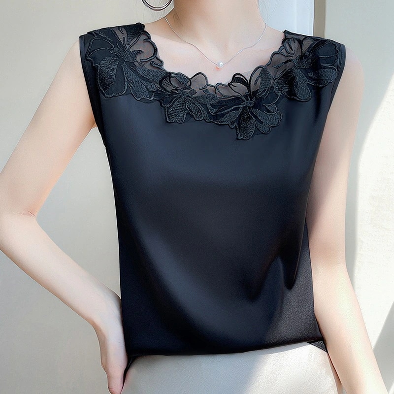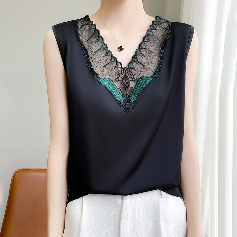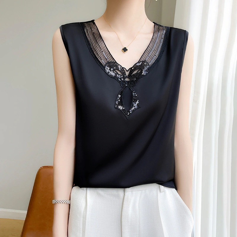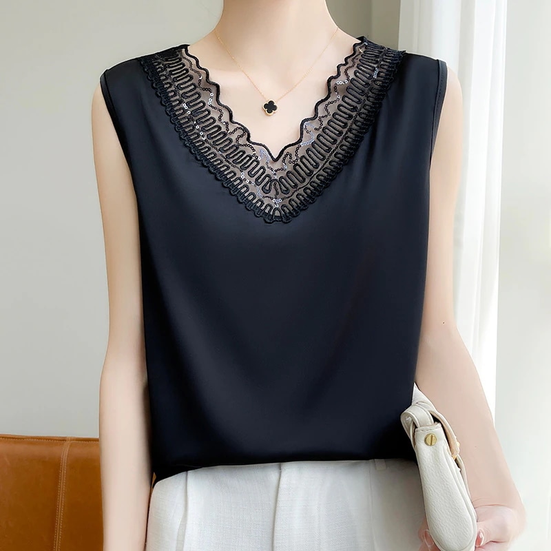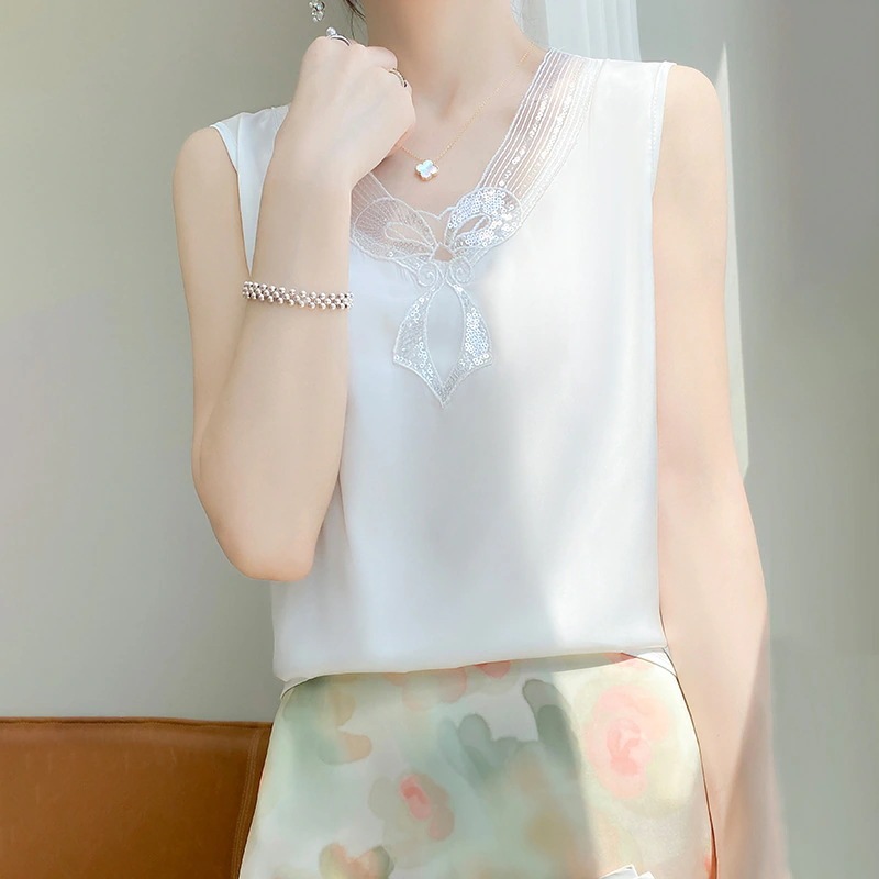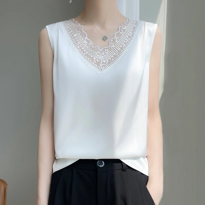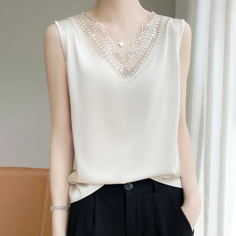 フレンチストラップタンクトップレディーススーツ用インナーレース夏用シルクサテンノースリーブシルクブラウス