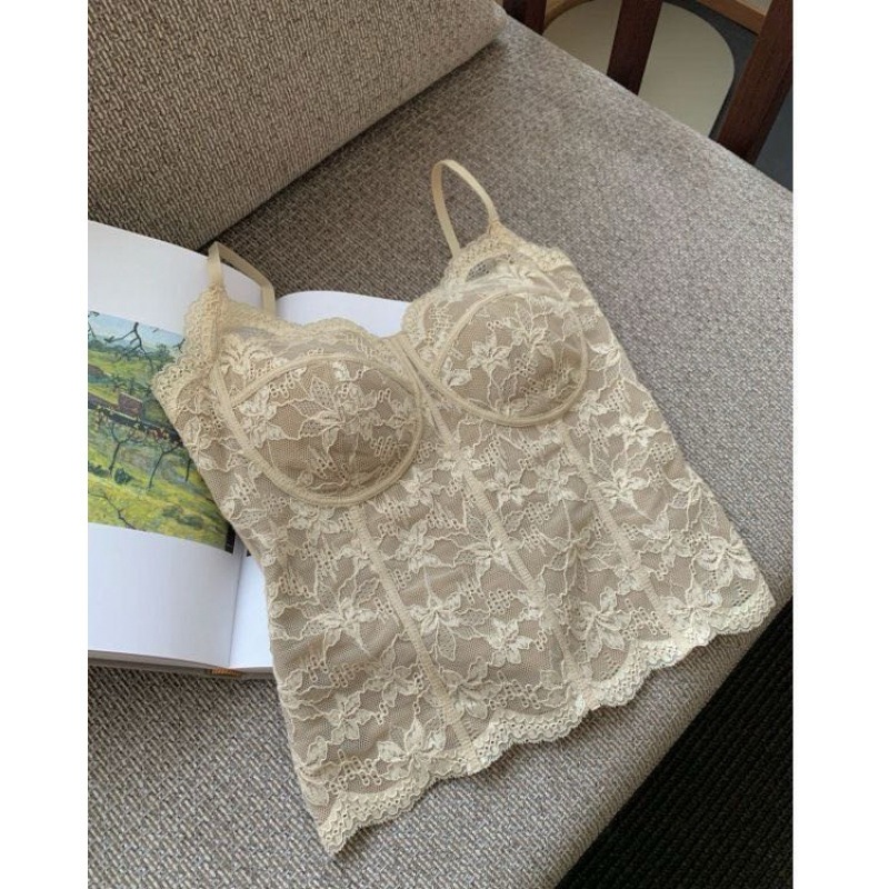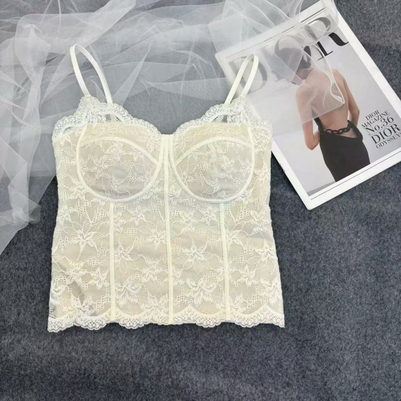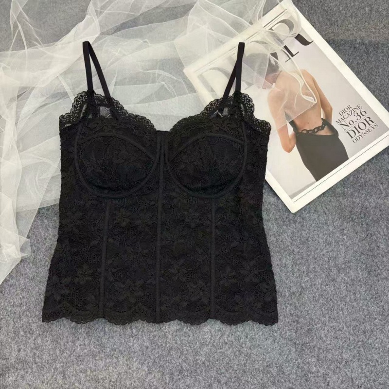 フィッシュボーンレースストラップスリム効果セクシーパッド付きアウター用ホットなレディースレースタンクトップブラック