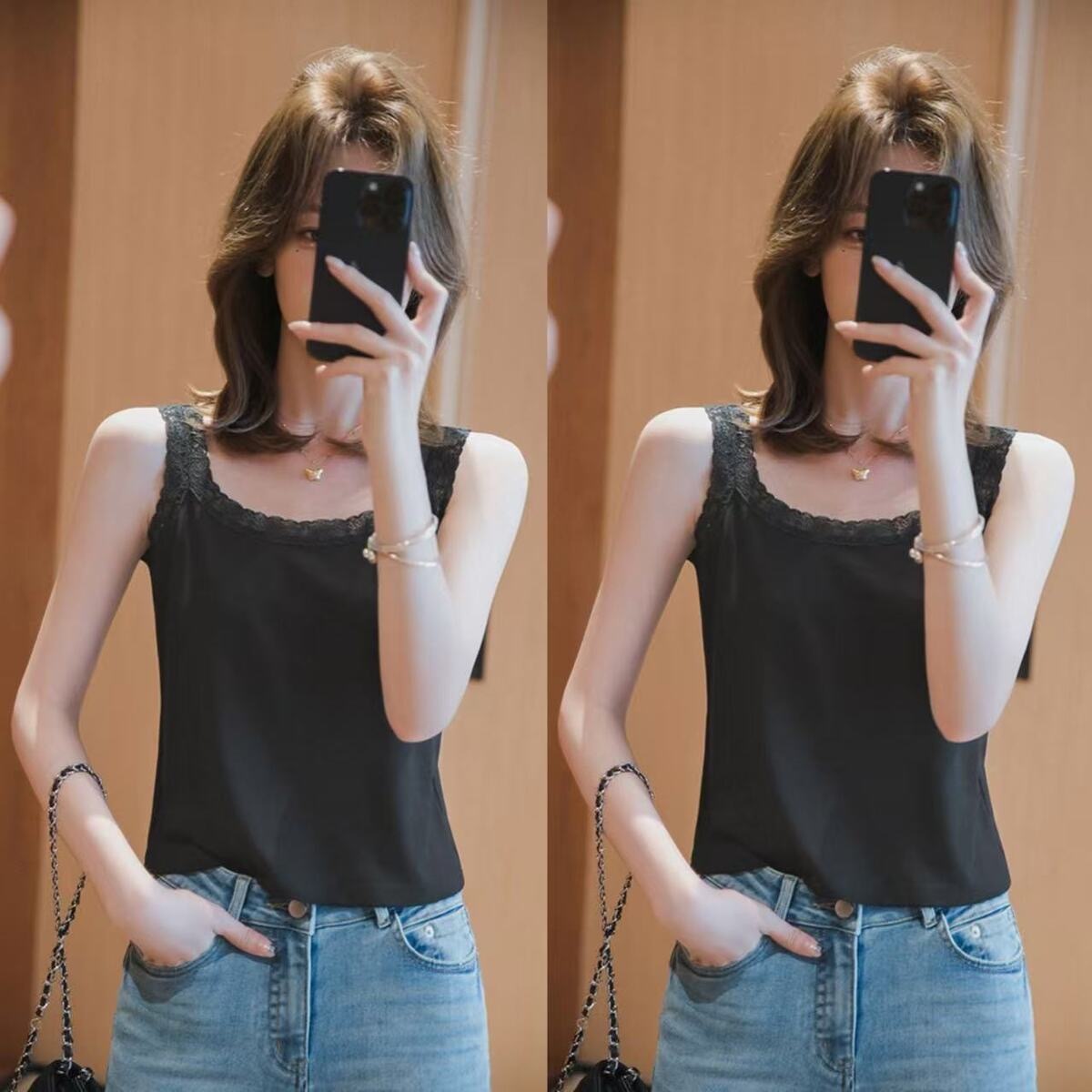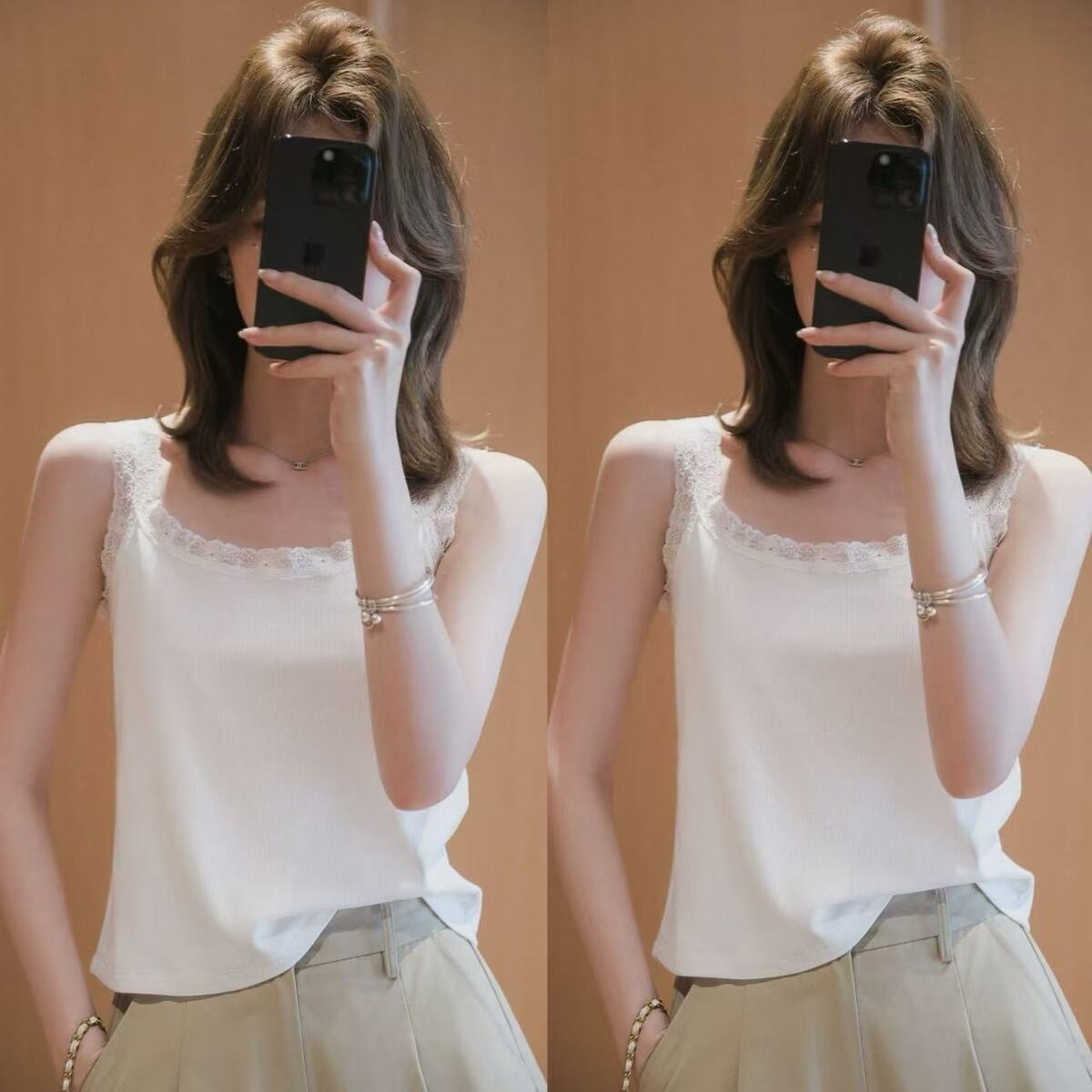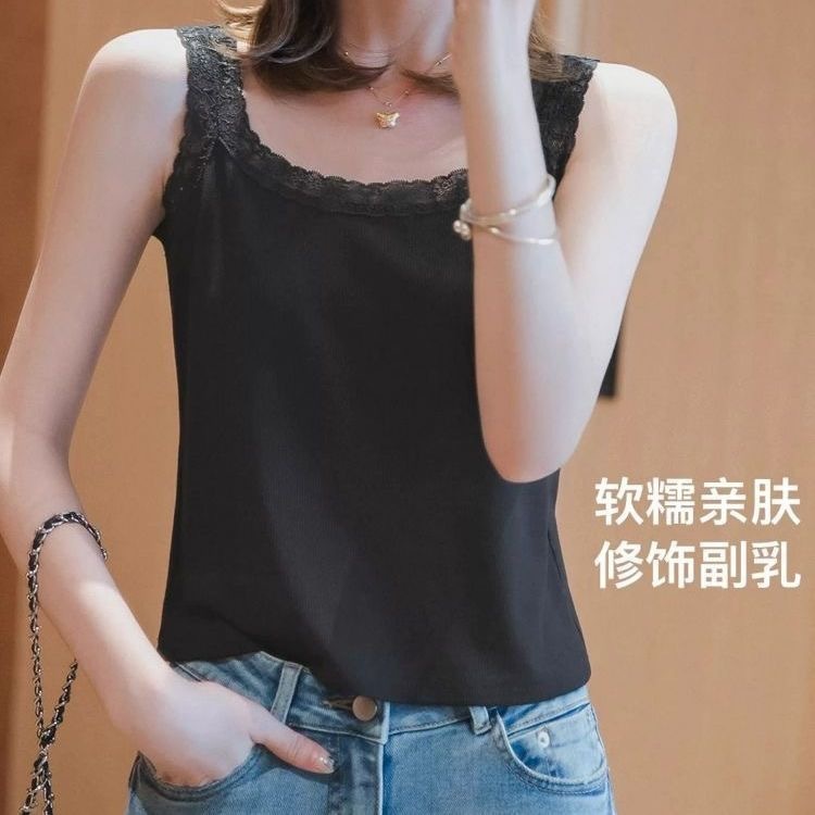 春夏用アイスシルクレースストラップベストレディースゆったりサイズアウターインナートップスノースリーブリブベストトレンド