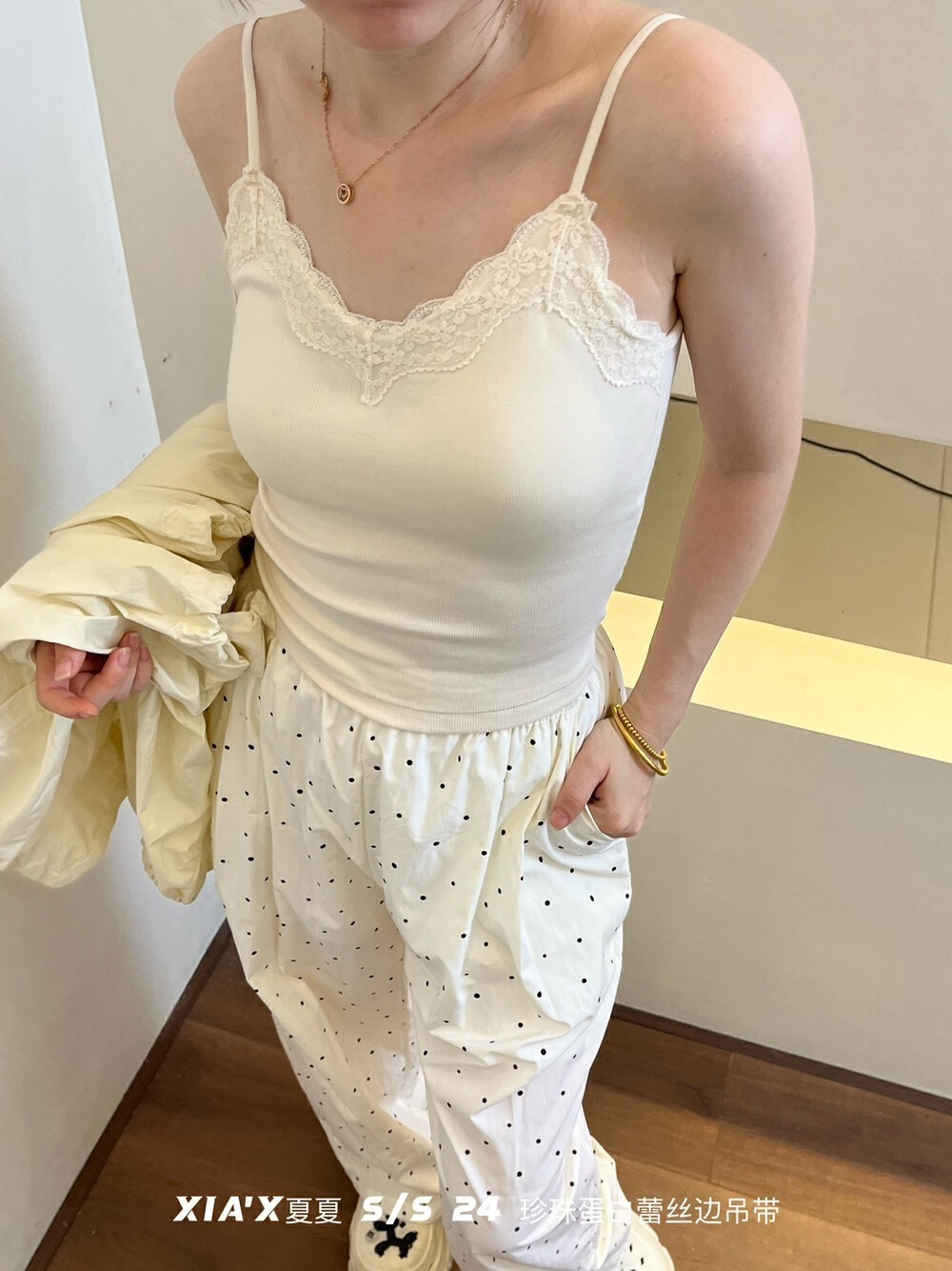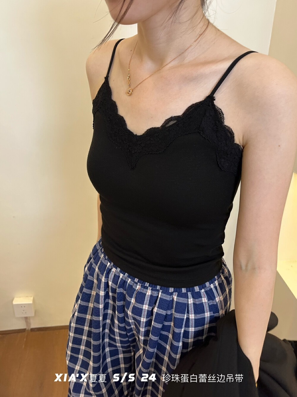 ピュアセクシー風セクシーレース縁取りストラップタンクトップレディース起毛インナーパッド入りアウター着用スリムショートトップス