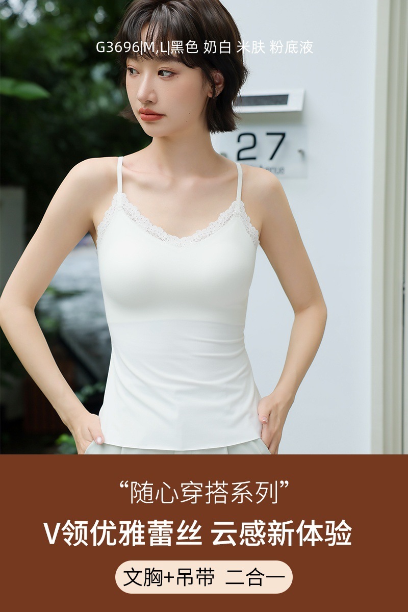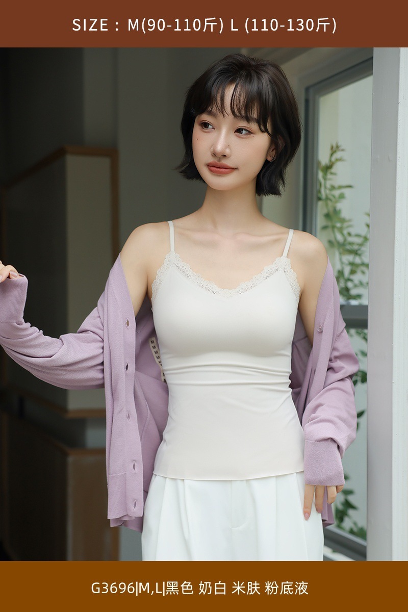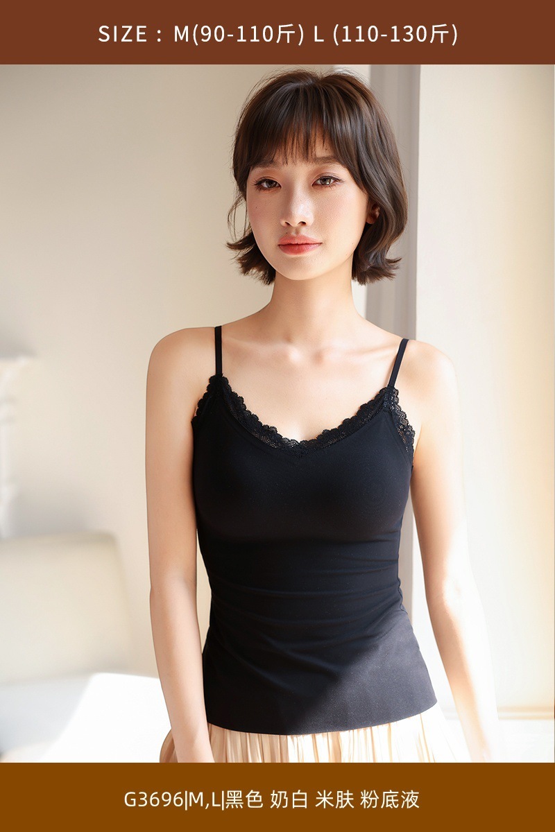 レースストラップタンクトップパッド付きスリムインナーノーブラミディアム丈起毛バックレスシームレスインナー