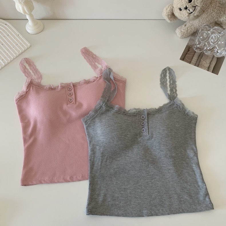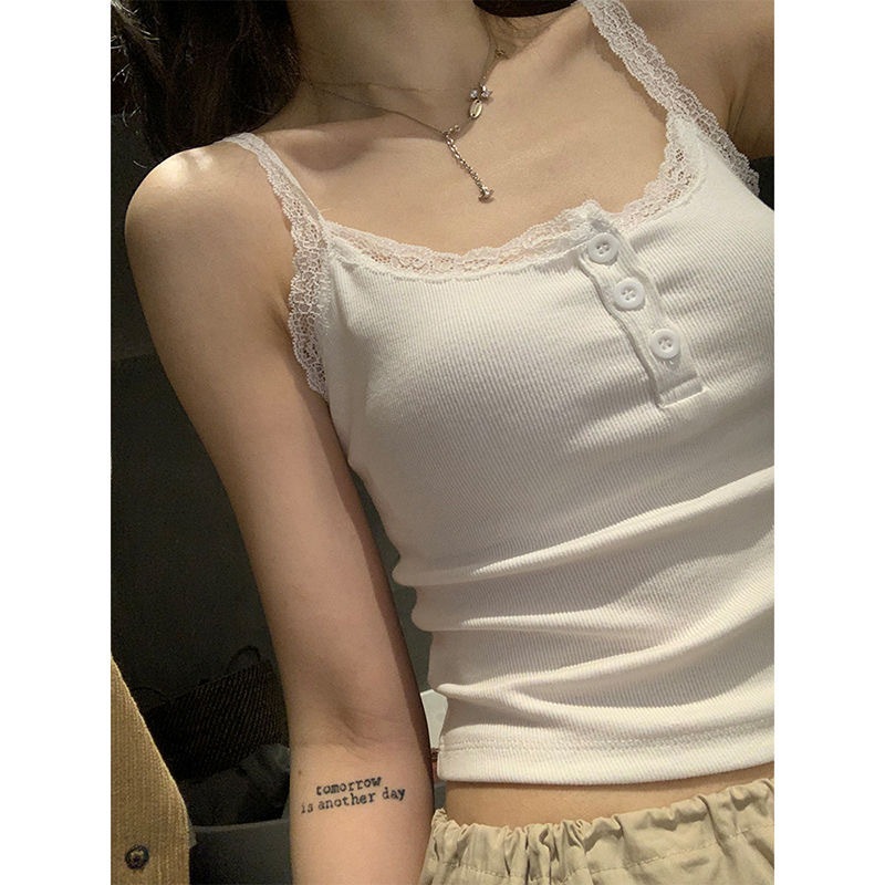 ピュアセクシー風フレンチストラップタンクトップレディース内蔵パッド付きインナー/アウター兼用 セクシーレースニッチボタンノースリーブベースレイヤー