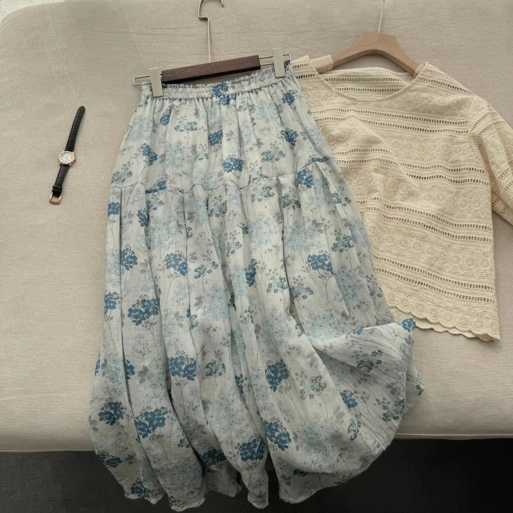2026夏 小藍花 ハイエンドコットンリネン スカート ミディ丈 Aライン ケーキスカート フェアリードレス