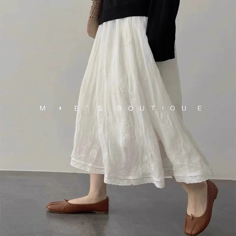 白レースフリルスカート女性春新作ヒップカバー細身Aラインフレアスカートロングスカート