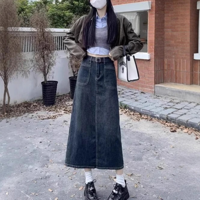 2026年春新作デニムスカート女性用ハイウエストミディ丈バックスリットAラインスカート