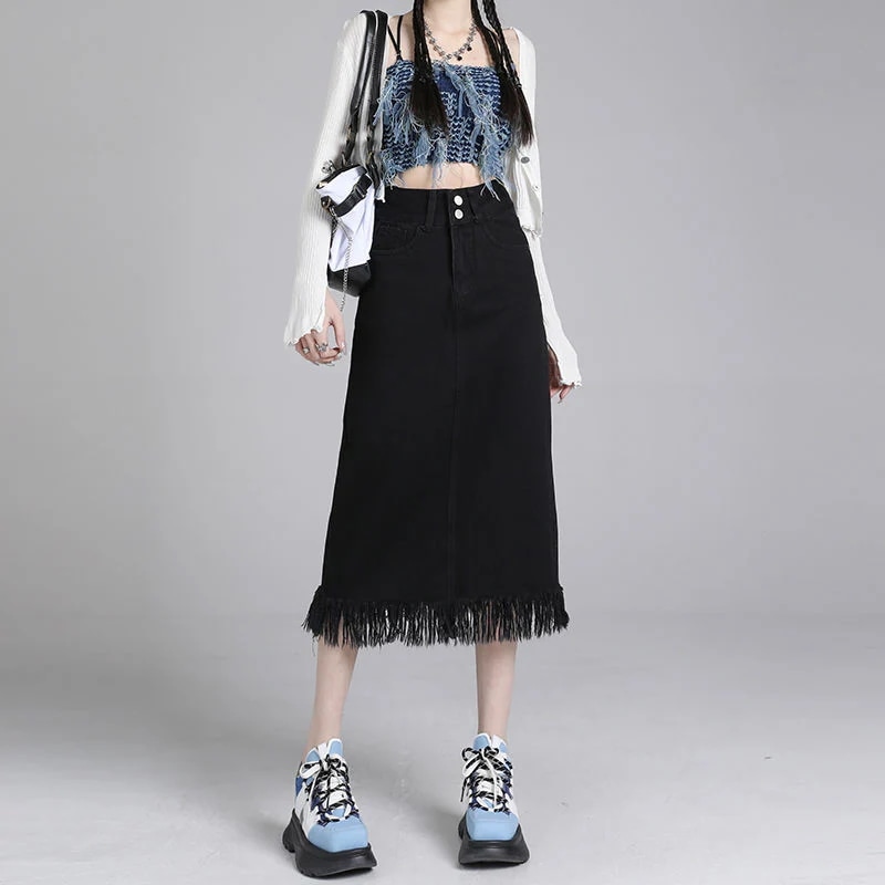 ハイウエストフリンジスリットデニムスカート女性用2026年春新作スリム効果Aラインフィットミディ丈スカート